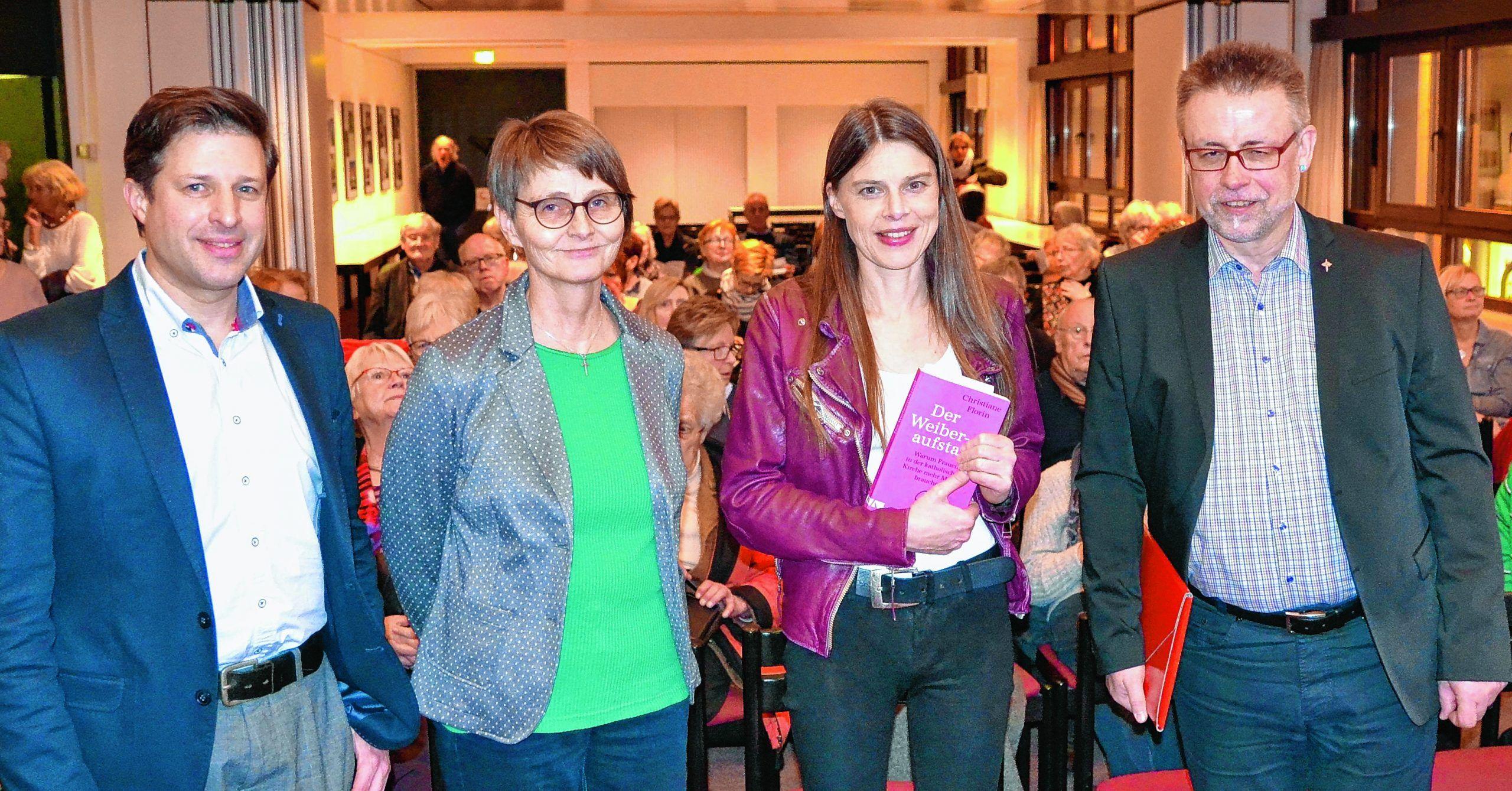 Die Leitung des Katholischen Forums – Pater Jürgen Heite (l.), Karin Stump (2. v. l.) und Siegfried Modenbach – hieß die Journalistin Christiane Florin willkommen. Foto: Körner