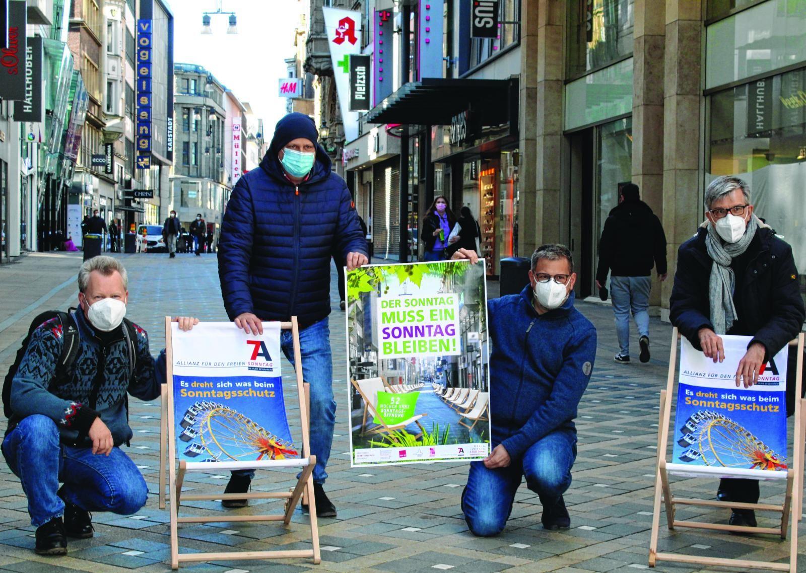 Werben mit Liegestühlen und einem neuen Plakat für den Sonntagsschutz: Benedikt van Acken (KAB), Reiner Kajewski von der Gewerkschaft ver.di, Thomas Renneke (Katholische Stadtkirche Dortmund) sowie Pfarrer Friedrich Stiller (von links). Foto: Maas