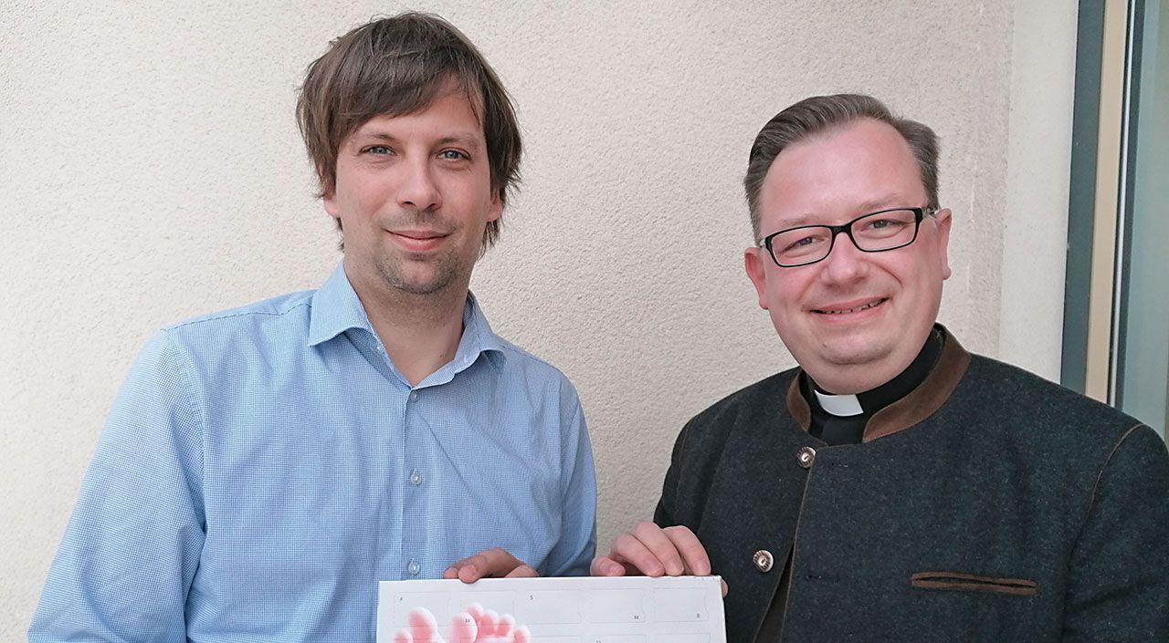 Diözesansekretär Daniel Fissenewert (links) und Diözesanpräses Sebastian Schulz stellen den Adventskalender zur Kampagne „Wurzel Mensch“ vor. (Foto: Kolping/Mario Polzer)