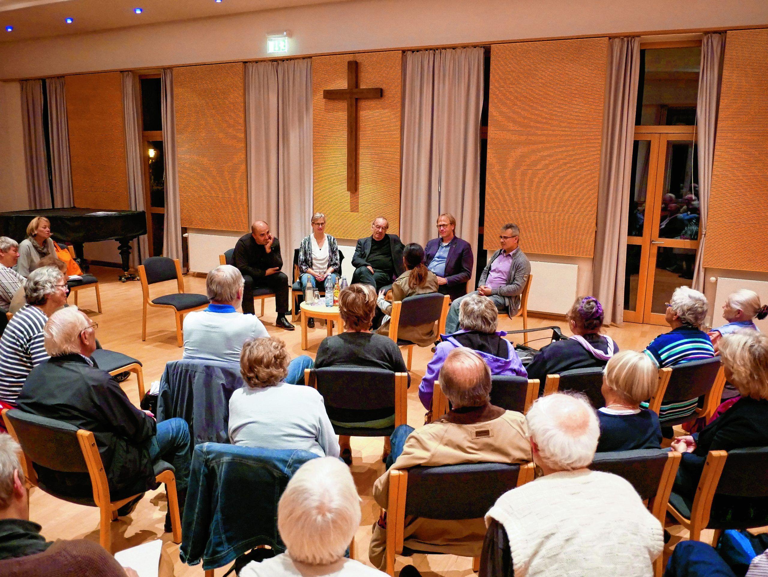 Im Gemeindehaus der evangelisch-­lutherischen Kirchengemeinde St. Marien sprachen Nihat Köse (Islamisches Kommunikationszen­trum Detmold), Matitjahu Kellig (Jüdische Gemeinde Herford-­Detmold), Josef Kalasch (Ezidischer Elternverein) sowie Dieter Bökemeier (evangelischer Landespfarrer für Ökumene und Mission) und Sabine Hartmann (Referentin für Ökumenisches Lernen) mit rund 50 Gästen über das Verhältnis von Religion und Politik.