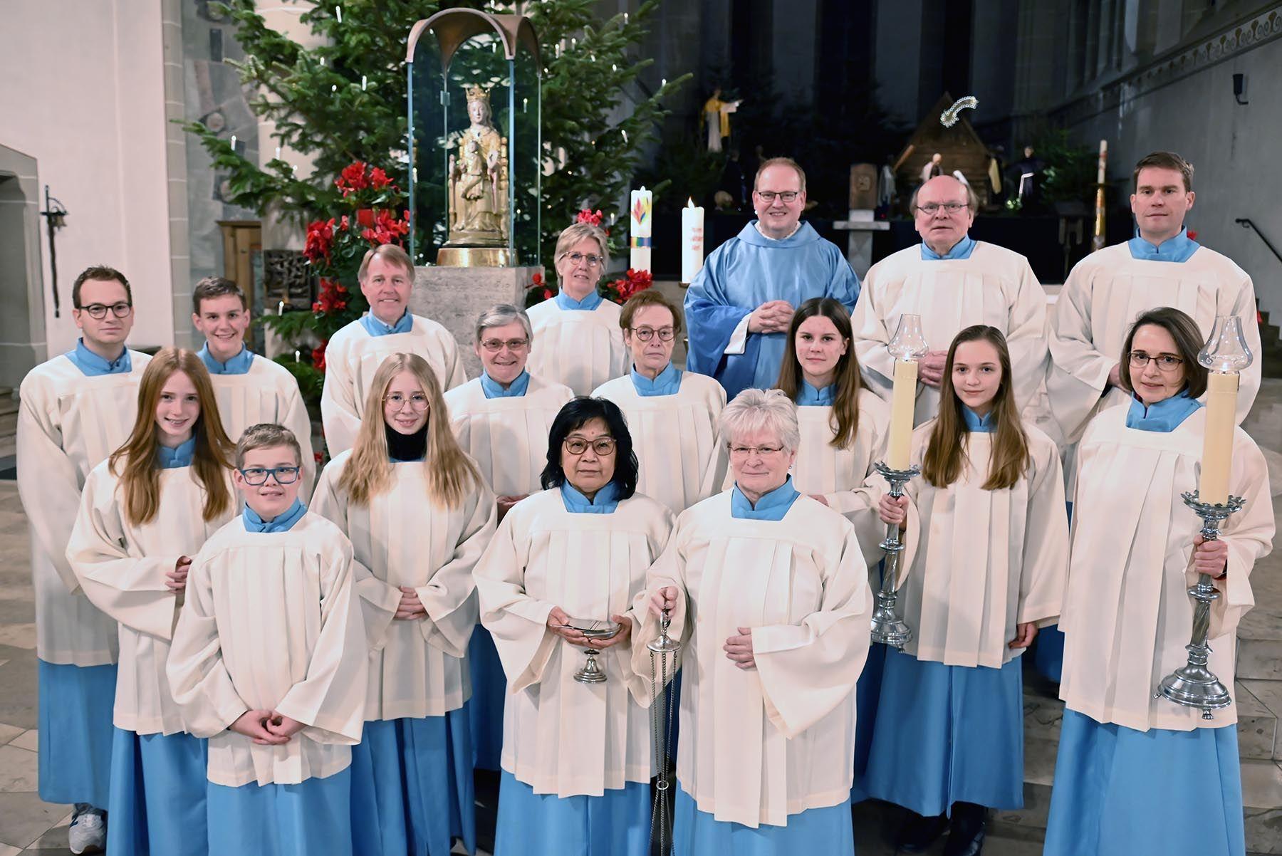 Sieht man die 16 Messdiener in die Basilika einziehen, bietet sich einem ein ungewöhnliches Bild. Durch den Mittelgang ziehen die hellblauen Gewänder in Richtung Altar. Kinder und Jugendliche gehen wie selbstverständlich neben Erwachsenen und Senioren. Voraus führen Weihrauch, Kreuz und Leuchter. Vorm Altar angekommen, begeben sich die Messdiener in eine Reihe und knien sich hin. Zwei ältere Damen bleiben stehen und verneigen sich. Eine ­Kniebeuge ist körperlich zu schwer.