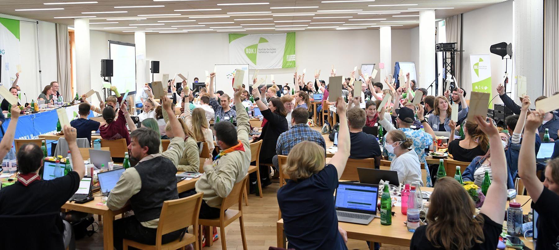 Demokratie ist mühsam, aber lohnenswert. Wie man sie praktiziert, können junge Leute u. a. in den katholischen Jugendverbänden lernen. Das Bild zeigt eine Abstimmung bei der BDKJ-Hauptversammlung im vergangenen Jahr. (Foto: BDKJ-Bundesstelle/Christian Schnaubelt)
