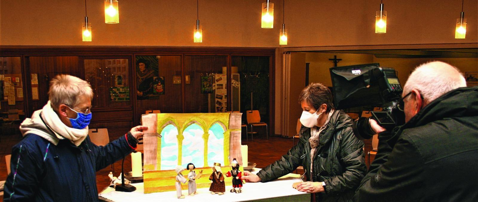 Geschichten aus dem Bibel- Koffer wurden in der Familien Kirche längst schon bildlich mit kleinen Puppen und allerlei Utensilien erzählt. Bisher waren dies aber Standbilder zu verschiedenen Anlässen, die die Kinder in der Kirche betrachten konnten. Eine Art Ganz-Jahres- Krippe. Diese Standbilder sollten nun verfilmt werden, weil die Kinder nicht mehr in die Kirche zum Bibel- Koffer kommen können. Gemeindereferentin Elsbeth Bihler und der pensionierte Schulleiter Ulrich Althaus konzipierten eine digitale Erzähl- Serie, in der die Zeichentrick- Figur der „Bibilla“ die Kinder mitnimmt.