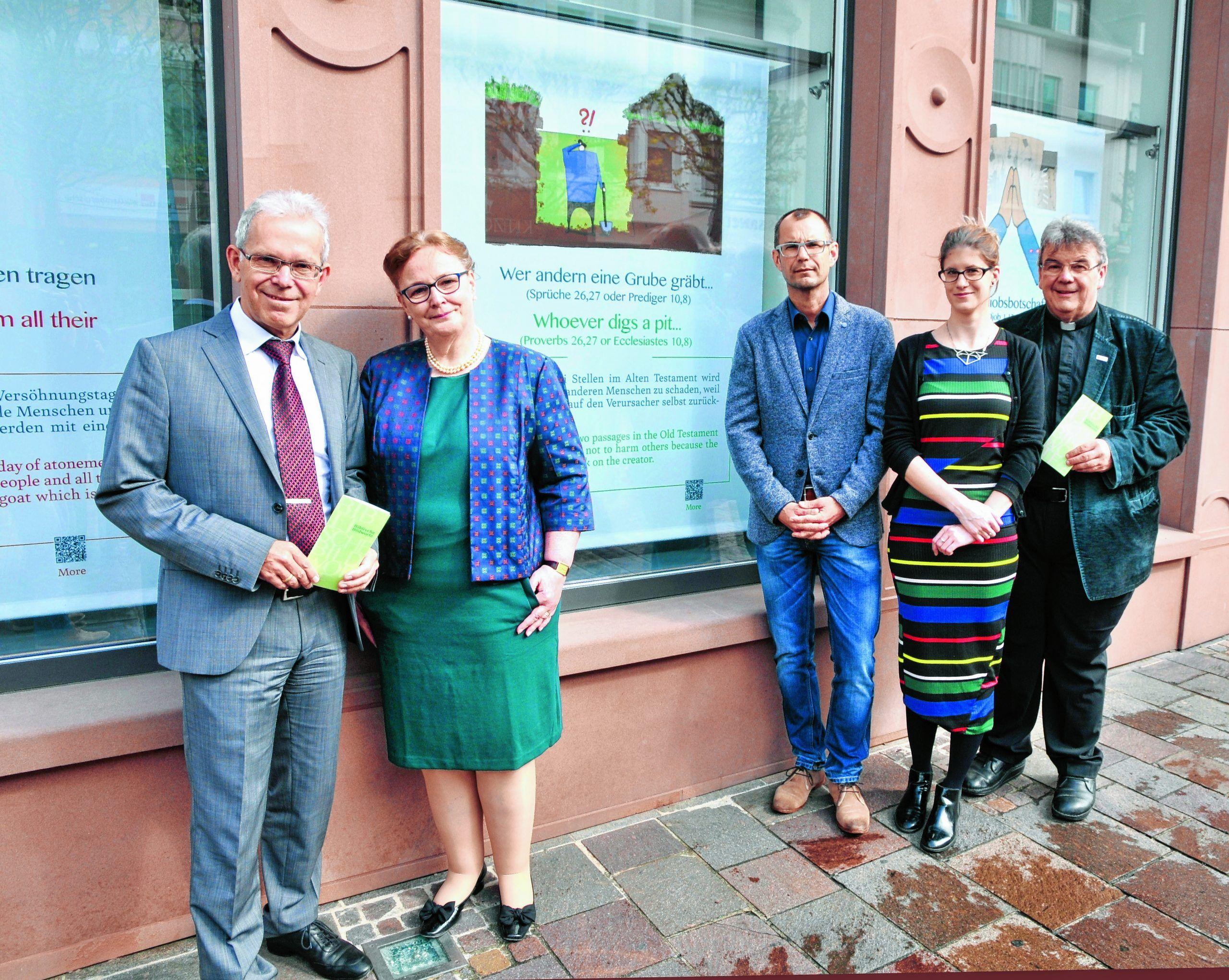 Auf dem Kamp in Paderborn geben bis 22. Juni Bibelworte den Ton an (v. l.): Dr. Richard Böger (Vorstandsvorsitzender BKC), Dr. Ulrike Kurth, Dr. Andreas Müller (Leiter Westfalenkolleg), Darina Výbohová und Monsignore Georg Austen (Generalsekretär Bonifatiuswerk). Foto: Flüter
