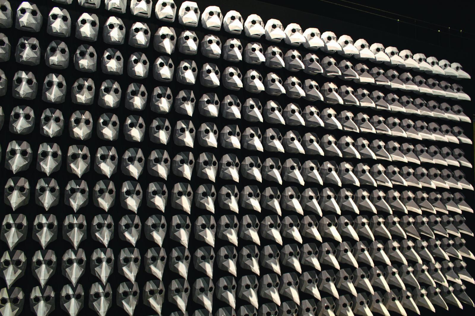 Beeindruckendes Bild: Je nach Blickwinkel des Betrachters scheinen sich die Gesichter der Masken zu bewegen. Rund 50 Hernerinnen und Herner bastelten sie vor der Corona-Pandemie. Bis zu zwei Stunden waren sie mit einer Maske beschäftigt. Foto: Maas