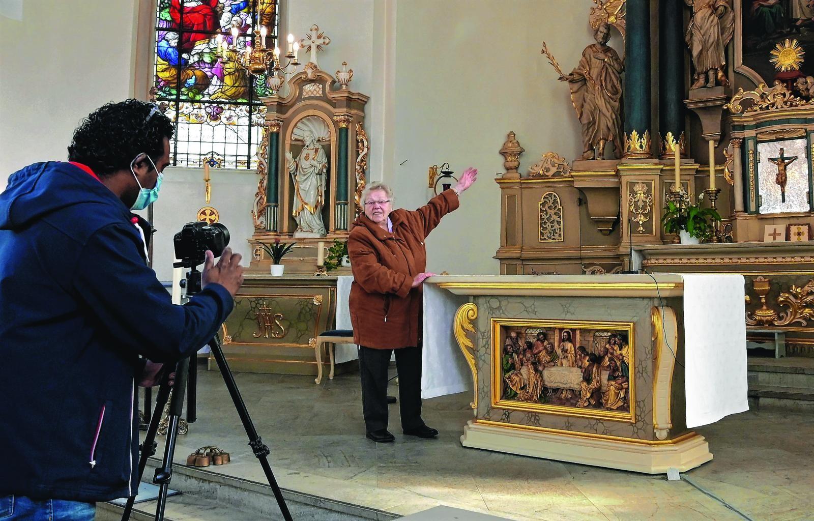 Gertrud Meyer erklärt bei der Kirchenführung die Altarbilder und die Figuren der Heiligen. Nikolas Geurten filmt sie dabei. Foto: Leskovsek