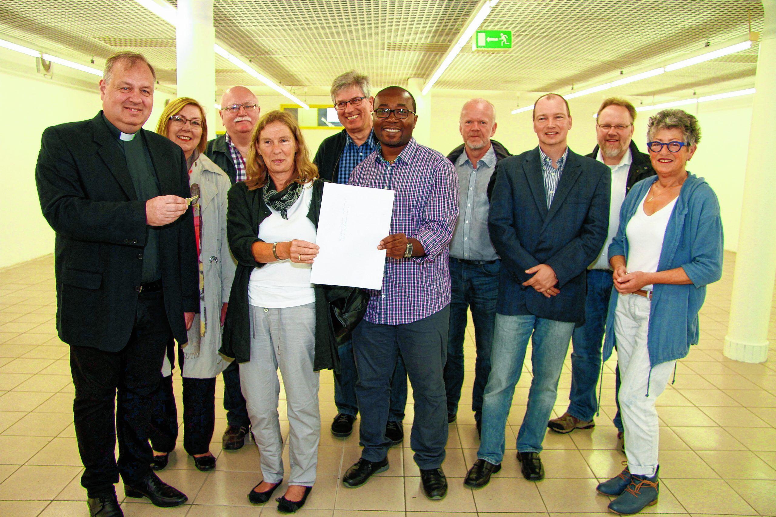 Pastor Thorsten Neudenberger (l.) mit dem Schlüssel für die Vorsitzende des Flüchtlingshelferkreises, Petra Buschmann-Simons (4. v. l.). Sie hält mit dem Flüchtlingskoordinator Joel Zombou den unterschriebenen Vertrag in den Händen. Zur Schlüsselübergabe kamen auch Sozialdezernentin Christine Busch (2. v. l.), Vertreter der Kirchengemeinde St. Elisabeth und der evangelischen Kirche sowie Dekanatsreferent Ludger Büngener (2. v. r). Foto: Plamper