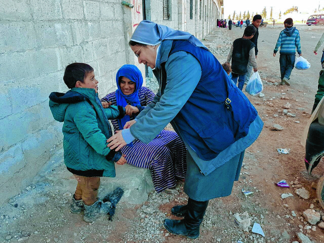 Vor ihrem Ordenseintritt hat Schwester Annie ein Technik-­Studium absolviert, was ihr nun in vielen Fällen hilft. So hatten Ende 2016 der Diözesan-­Caritasverband und das Erzbistum Paderborn 80 000 Euro zur Verfügung gestellt, um in den verbliebenen kleinen Schneiderei-Betrieben in Aleppo fast 8 000 Winter­anoraks für Kinder produzieren zu lassen – wichtige Aufträge für die kleinen Unternehmen und natürlich eine wertvolle Hilfe für die Familien, die verzweifelt nach warmer Bekleidung für die Kinder anfragen. Bis hin zur Stärke des Innenfutters hat die resolute Ordensfrau die Produktion penibel überwacht. Am warmen Futter sparen? Nicht mit Schwester Annie
