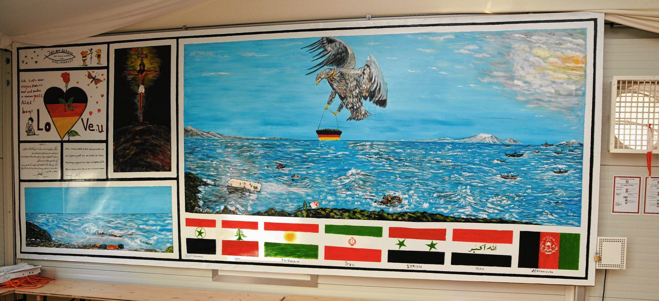 Eine Art Dankeschön zu sagen: Das große Gemälde im Speisezelt der Notunterkunft haben Flüchtlinge gemalt. Es zeigt einen „deutschen“ Adler, der Menschen aus dem Mittelmeer rettet.Foto: Flüter