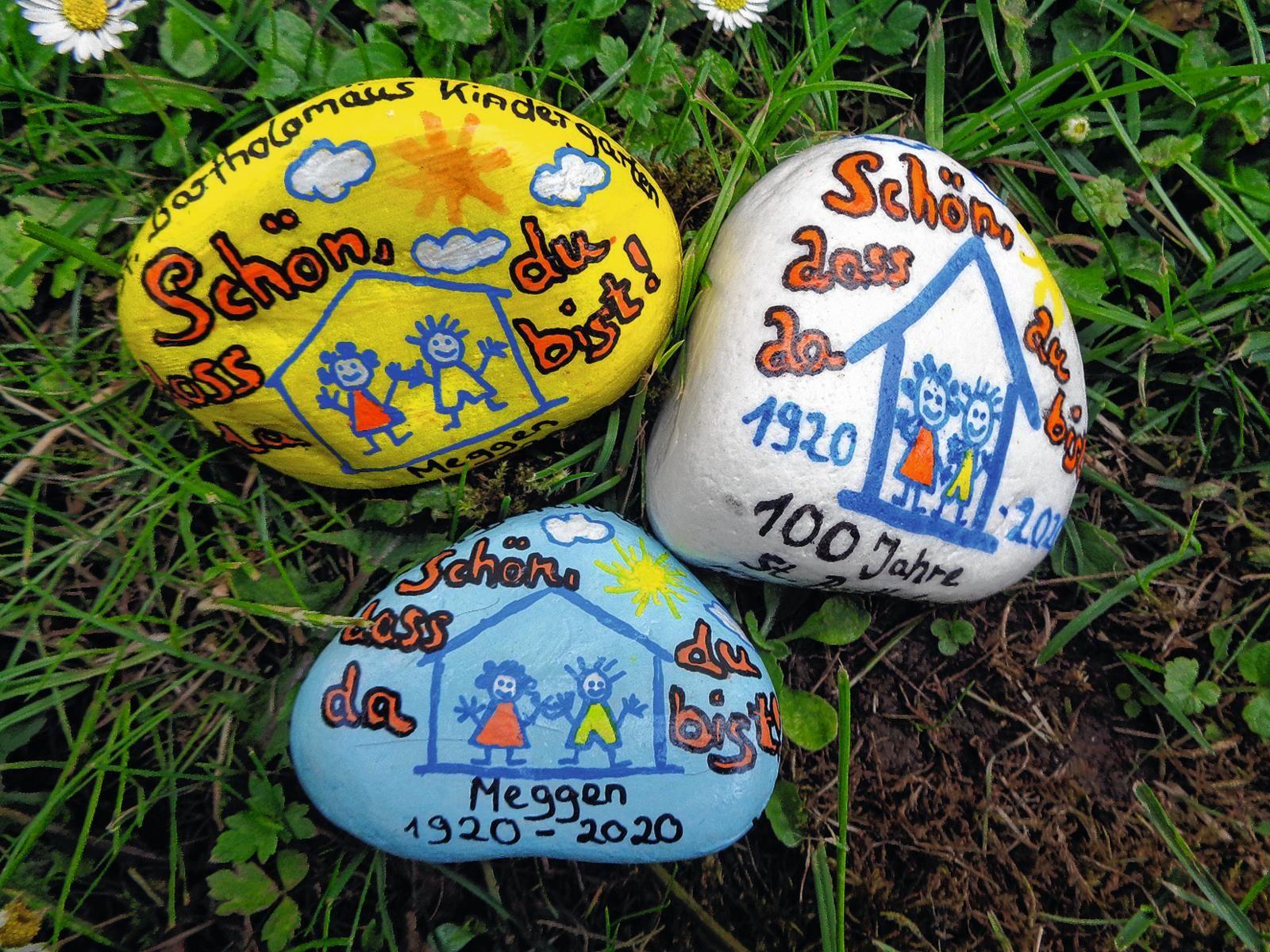 Bunte Jubiläumssteine wurden im ganzen Dorf versteckt. Wer sie fand, erhielt eine Überraschung. Foto: Kita gGmbH