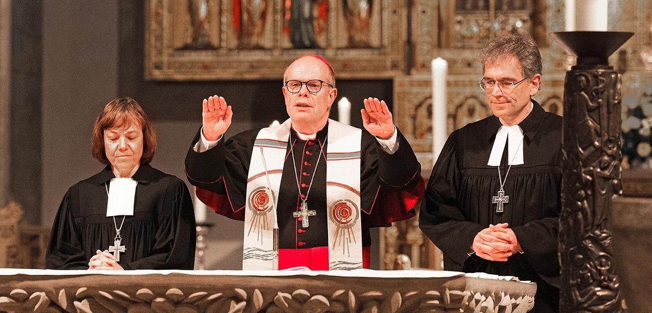 Das letzte Mal? Annette Kurschus, Ratsvorsitzende der Evangelischen Kirche in Deutschland (EKD), und Johannes Wübbe (Mitte), Weihbischof in Osnabrück, beim ökumenischen Gottesdienst zur Eröffnung der „Woche für das Leben“ am 22. April dieses Jahres im Osnabrücker Dom. (Foto: KNA)