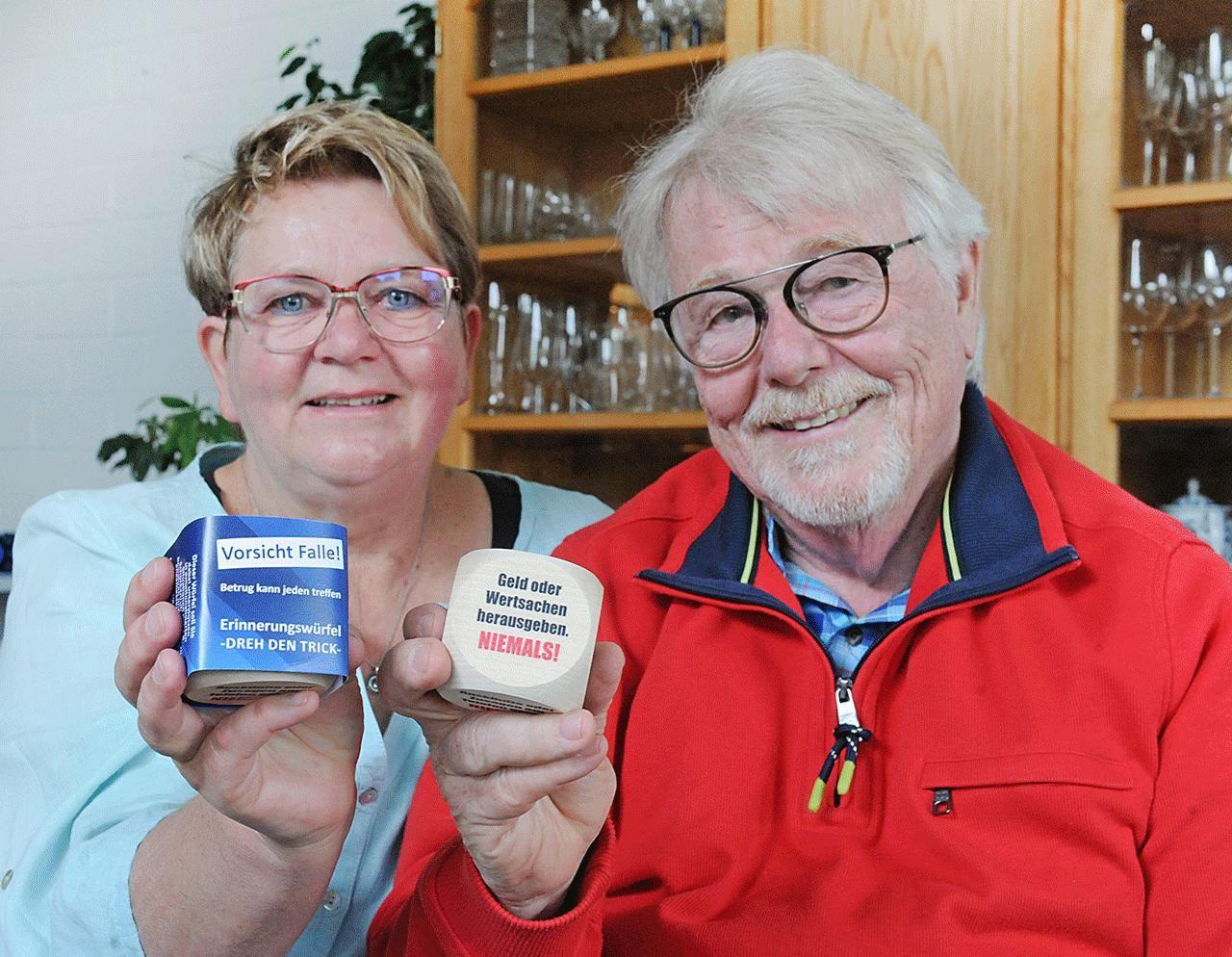 Merkhilfe gegen fiese Maschen: Dorothea Klute-­Huxol und Manfred Borchert stellen den Erinnerungswürfel vor, mit dem Senioren vor Telefonbetrug gewarnt werden sollen.(Foto: Andreas Wiedenhaus)