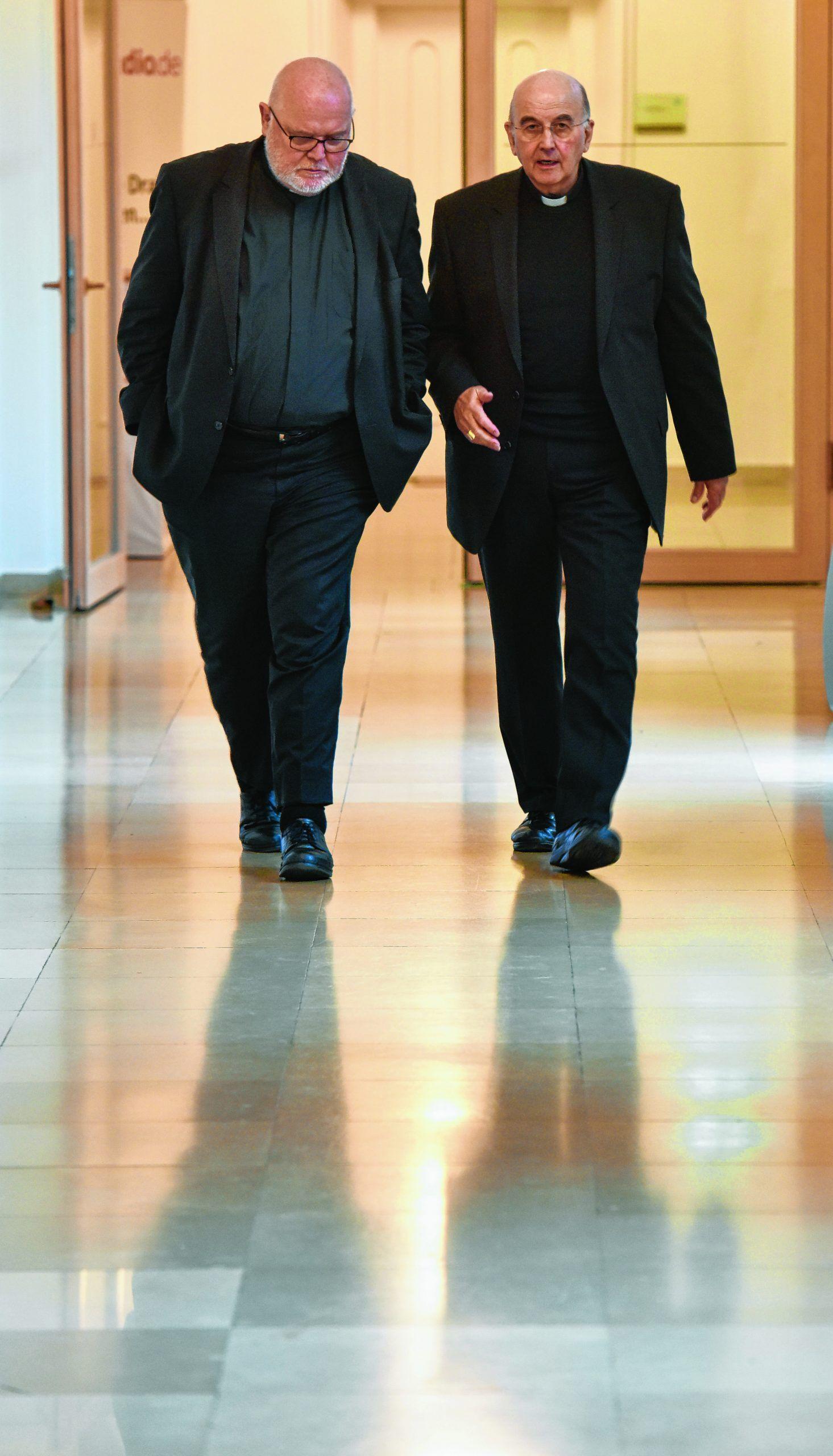 Der Vorsitzende der Bischofskonferenz, Kardinal Reinhard Marx (l.), und Bischof Felix Genn in Bergisch Gladbach.Foto: KNA