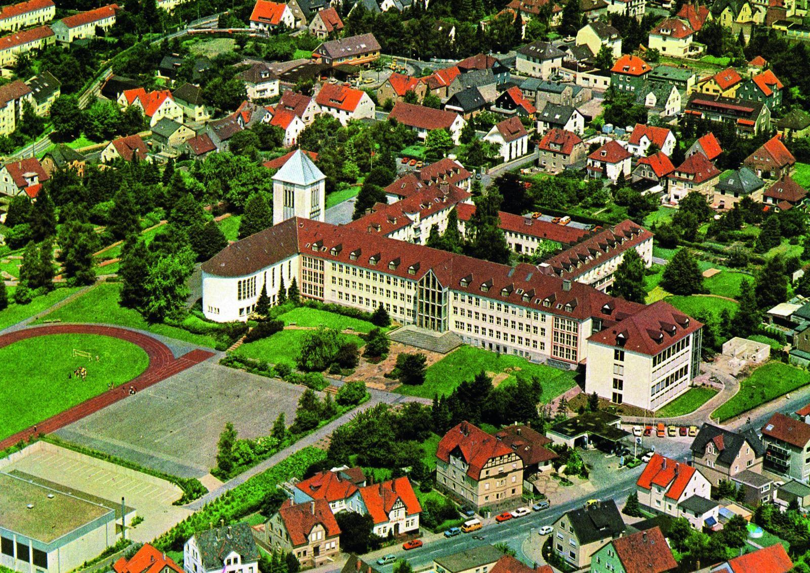 Ein Luftbild der Marienschule und der Kirche der Ursulinen in Bielefeld-Schildesche in den Neunzigerjahren. Foto: Sammlung Barbara Handt