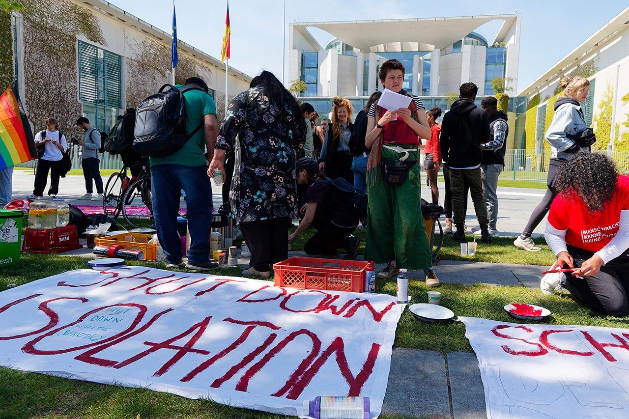 Mittwoch vergangener Woche in Berlin: Während drinnen der Bundeskanzler mit den Ministerpräsidentinnen und Ministerpräsidenten beraten hat, protestierten vorm Kanzleramt Flüchtlingsorganisationen.