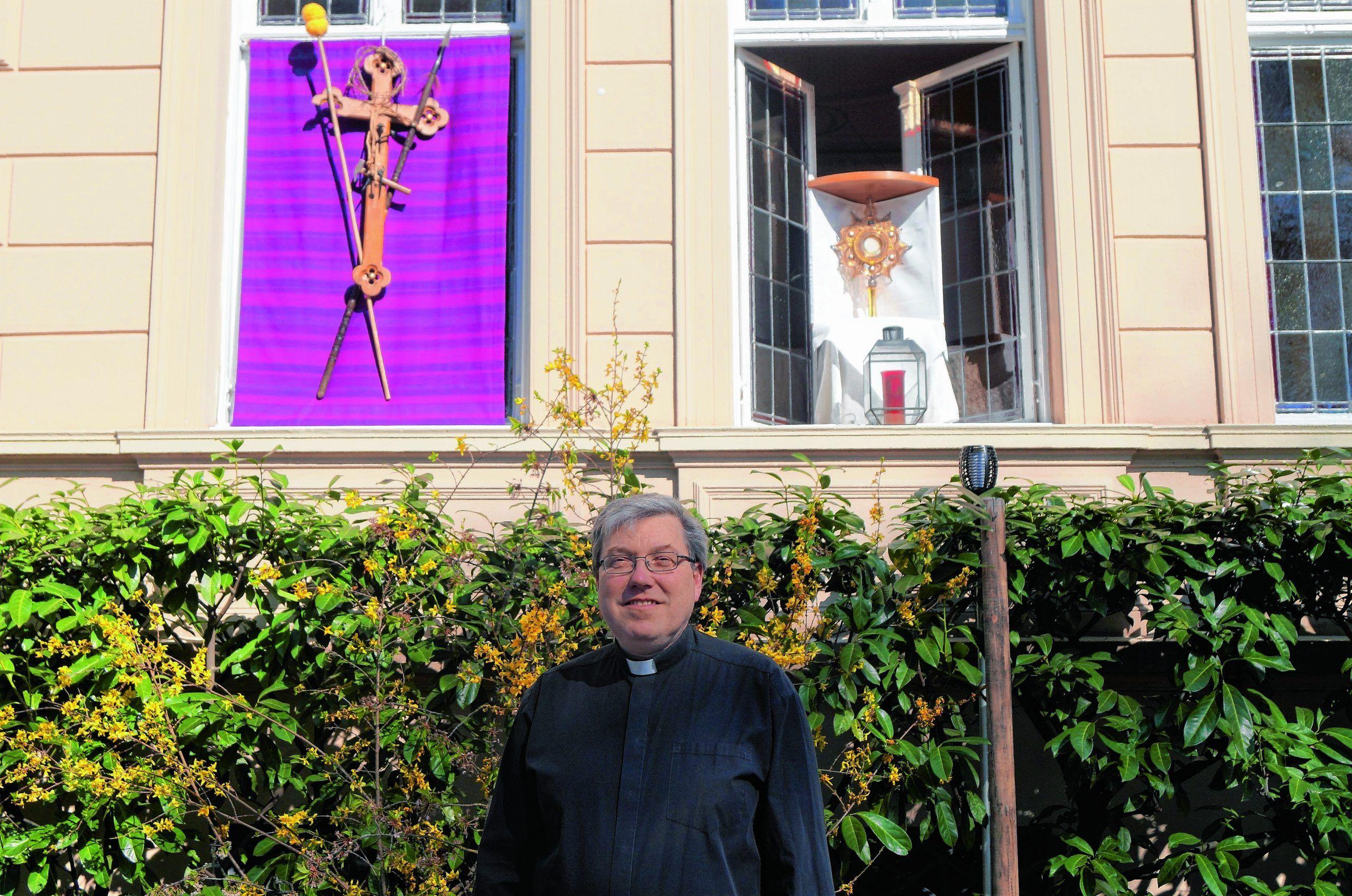 Die wohl ungewöhnlichste Art, den Glauben derzeit zu erleben, bietet sich am Vinzenzkolleg, Oststraße21: Die Vinzentiner wollen jedem nicht nur das persönliche Gebet, sondern auch die direkte Anbetung eröffnen. Deshalb wird das Allerheiligste und ein Passionskreuz in zwei benachbarten Fenstern im Erdgeschoss des Jugendstil-