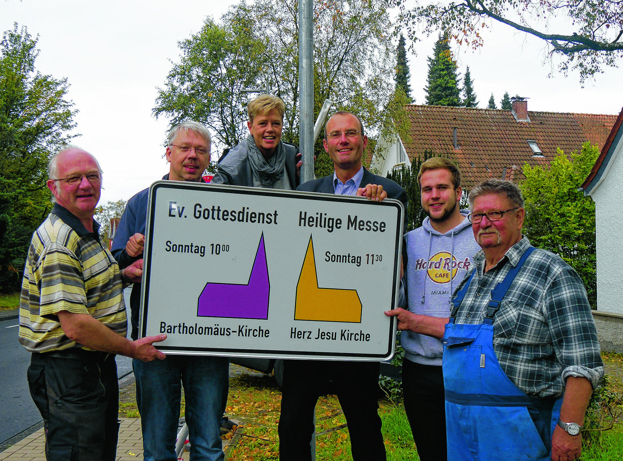 Beim Anbringen des neuen Hinweisschilds an der Bodelschwinghstraße in Bielefeld-Brackwede (v. l.): Küster Hans-Jürgen Neudecker und Pfarrer Hubert Maus von der Gemeinde St. Elisabeth-Gemeinde, Presbyterin Conny Kurosch und Pfarrer Ingo Stucke von der Bartholomäus-Gemeinde sowie Peter Gudelius und Azubi Dennis Becker von der Firma Gudelius. Foto: Jacobsen