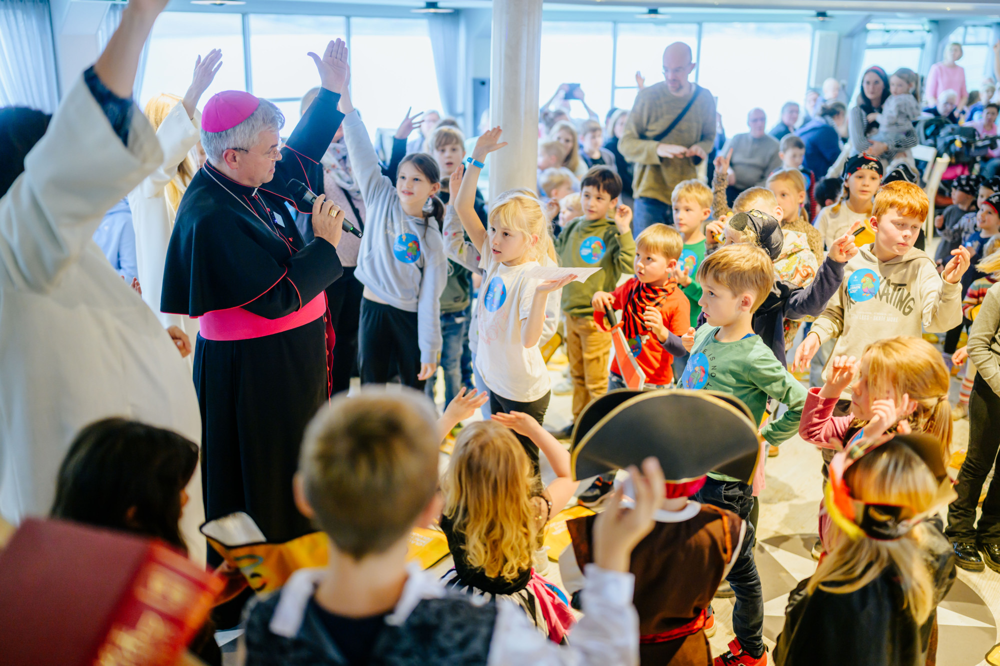 An Bord derweil ein buntes Bild. Die Kinder haben Augenklappen und aufblasbare Säbel dabei, tragen Hüte mit Totenkopf, haben sich teilweise sogar geschminkt im Gesicht. Auch so kann ein Familiengottesdienst aussehen. Erzbischof Dr. Udo Markus Bentz strahlt, als er durch die Reihen geht: „Laut, quirlig – schön!“, so sagt er und bewundert, wie großartig sich viele der Kinder verkleidet haben – und wie viele überhaupt gekommen sind. Die Piratinnen und Piraten haben sich schon gemeinsam vor der großen Truhe versammelt, die sofort ins Auge fällt. Was da wohl drin ist?