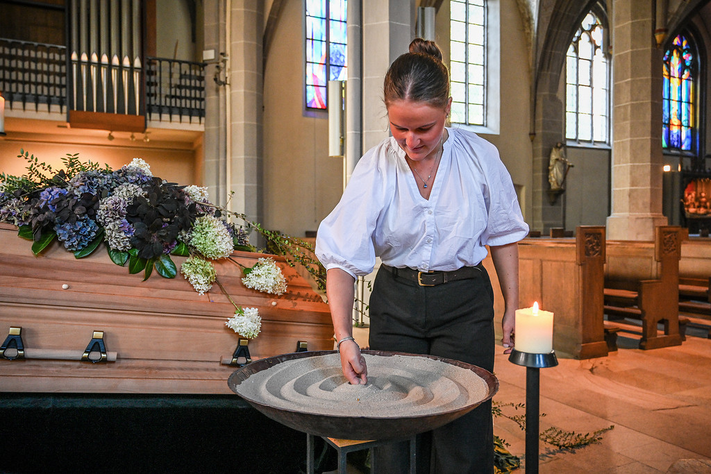 „Es gibt keine Routine“, freut sich die 22-Jährige. An diesem Spätsommertag etwa bringt sie morgens die Todesbescheinigung und das Familienstammbuch eines Verstorbenen zum Standesamt und holt dort Sterbeurkunden ab. Im Anschluss hilft sie in einer Kirche, alles für eine Begräbnisfeier vorzubereiten: Sie trägt mit Kollegen den Sarg in den Altarraum, stellt Kerzen bereit. Bevor die ersten Trauernden kommen, macht sie für die Familie noch Fotos von dem blumengeschmückten Sarg vor dem Altar.