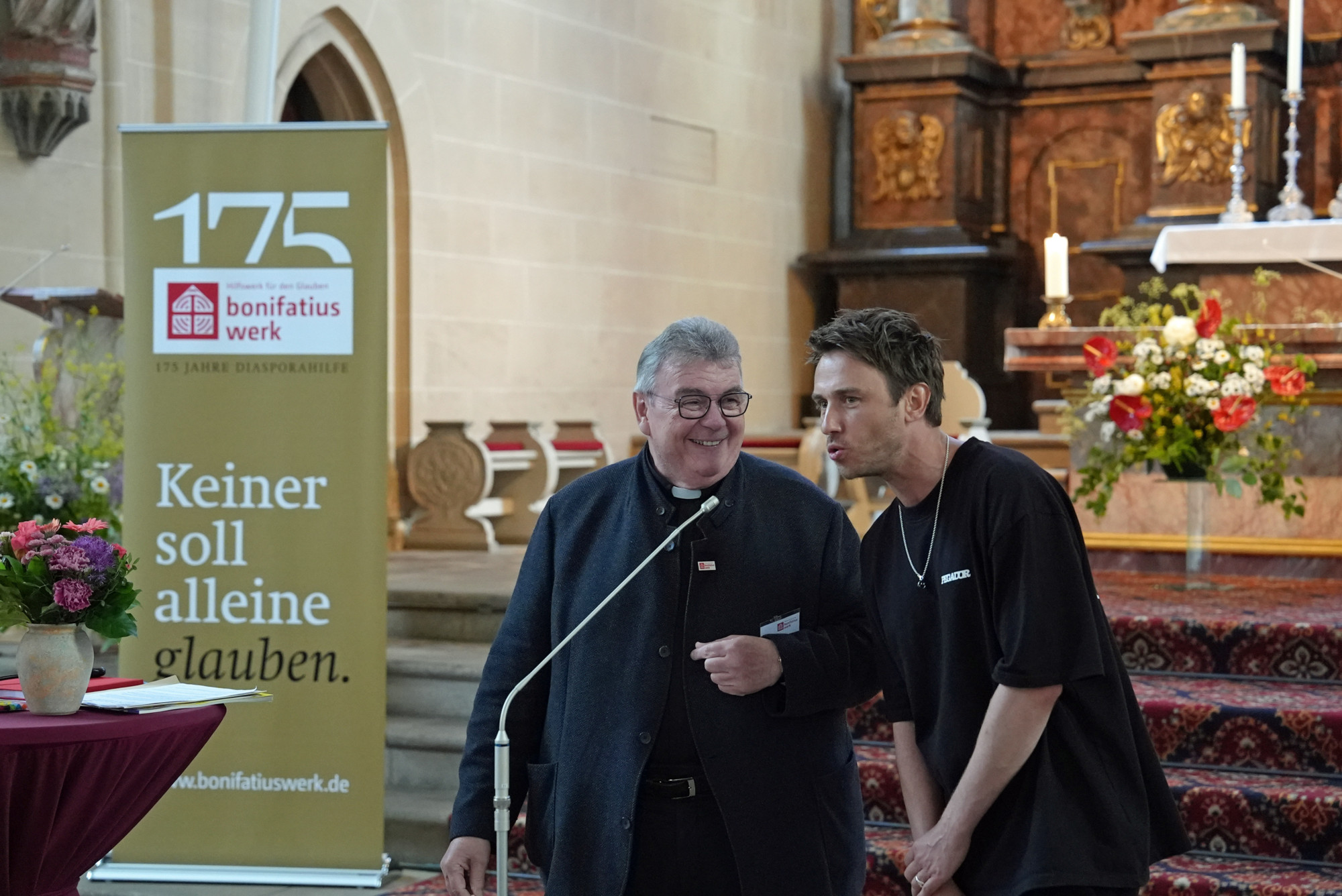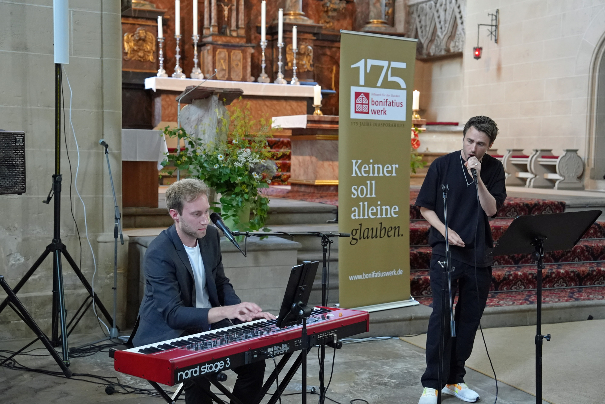Das Weimarer Duo Beat2 sorgte mit Liedern von Udo Lindenberg wie „Hinter’m Horizont geht es weiter“ für die musikalische Begleitung. Der Eintritt zur Ausstellung ist frei, es wird um Spenden gebeten. Mit dem Gesamterlös der Ausstellung, die anlässlich des 103. Katholikentages in Erfurt gezeigt wird, unterstützt das Bonifatiuswerk gemeinsam mit Udo Lindenberg zwei sozial-karitative Projekte: die Mutter-Kind-Einrichtung „Haus Teresa“ in Kirchworbis sowie die von UNICEF geförderte Hilfe für Rohingya-Kinder im größten Flüchtlingslager der Welt in Bangladesch. Die Ausstellung ist täglich ab 10 Uhr geöffnet, jeweils um 12 Uhr findet ein Friedensgebet statt.