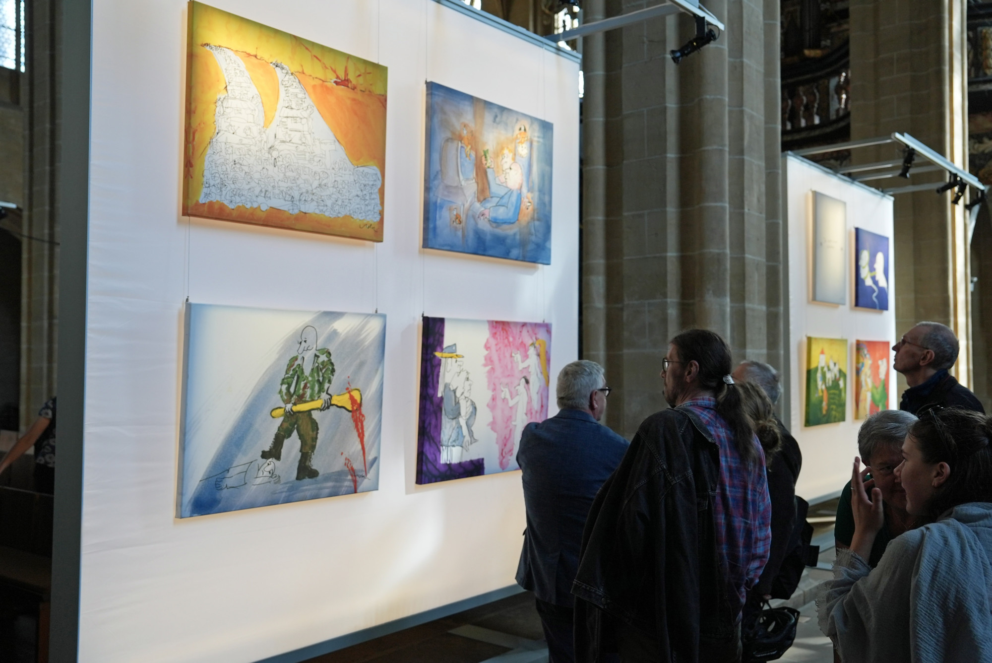 An-Gebote zum Leben: Am fünften Ausstellungstag von „Udos 10 Geboten“ konnte das Bonifatiuswerk den 12.500 Besucher in der Erfurter St.-Severi-Kirche begrüßen. Anlässlich des Katholikentags sind 24 Gemälde des Panikrockers Udo Lindenberg zu den biblischen Zehn Geboten zu sehen.