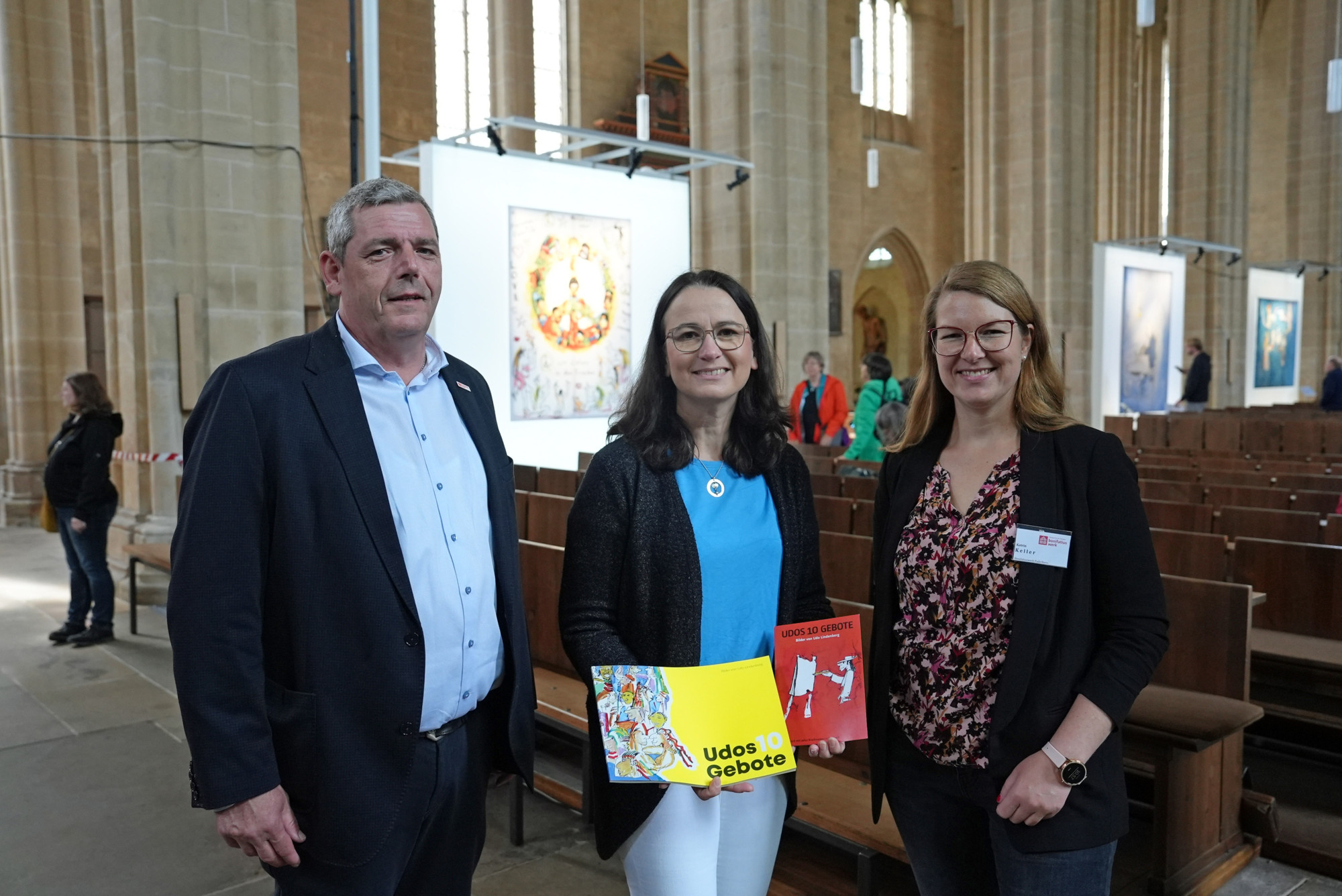Das Interesse am Zusammenspiel von Kunst und Kirche war es, das Christel Schmidt am Freitag in die Ausstellung zog. Sie ist die 12.500 Besucherin der Ausstellung und hat von Bonifatiuswerk-Geschäftsführer Ingo Imenkämper und Katrin Keller, Leiterin des Bereiches Fundraising im Hilfswerk, einen Ausstellungskatalog und ein limitiertes Briefmarkenheft mit allen Zehn Geboten der Ausstellung „Udos 10 Gebote“ geschenkt bekommen. „Udo Lindenberg ist ein großer Künstler, und es ist beeindruckend, dass er nicht nur mit der Musik sondern auch mit dem gemalten Bild seine Botschaft von Frieden verkündet“, erklärt die Emmelshausenerin Christel Schmidt. Ingo Imenkämper ist froh über das große Interesse an der Ausstellung: „Der Zuspruch zeigt, dass ‚Udos 10 Gebote‘ das widerspiegelt, was die Menschen in der aktuellen Zeit berührt und bewegt.“
