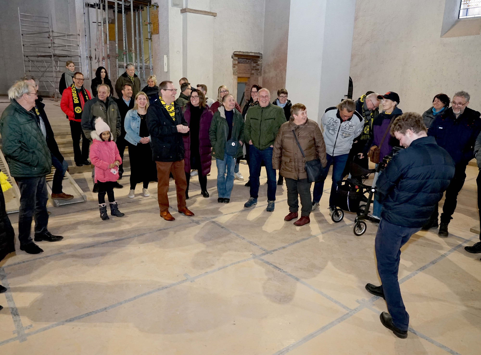Der Umbau der Dortmunder Dreifaltigkeitskirche für das Projekt BVB-Gründerkirche schreitet weiter voran. Seit September 2024 ist die Kirche geschlossen und seit Anfang 2025 sind deutliche Veränderungen am Kirchengebäude zu erkennen. Ein Bild vom Fortgang der Arbeiten machten sich bei einer Baustellenbegehung Mitglieder des Pfarrgemeinderates und des Kirchenvorstandes gemeinsam mit dem Paderborner Generalvikar Monsignore Dr. Michael Bredeck und Thomas Klöter, Leiter des Bereichs Pastorale Dienste im Erzbischöflichen Generalvikariat. Über die Baustelle geführt wurden sie von Architektin Claudia Bolle-Reißenweber, Innenarchitekt Ludger Schwarze-Blanke und den Projektleitern Karsten Haug und Stefan Magh. Mit dabei waren außerdem Vertreterinnen und Vertreter der Kooperationspartner, wie die Katholische Jugendhilfe Dortmund GmbH, der Sportverband DjK und weitere.