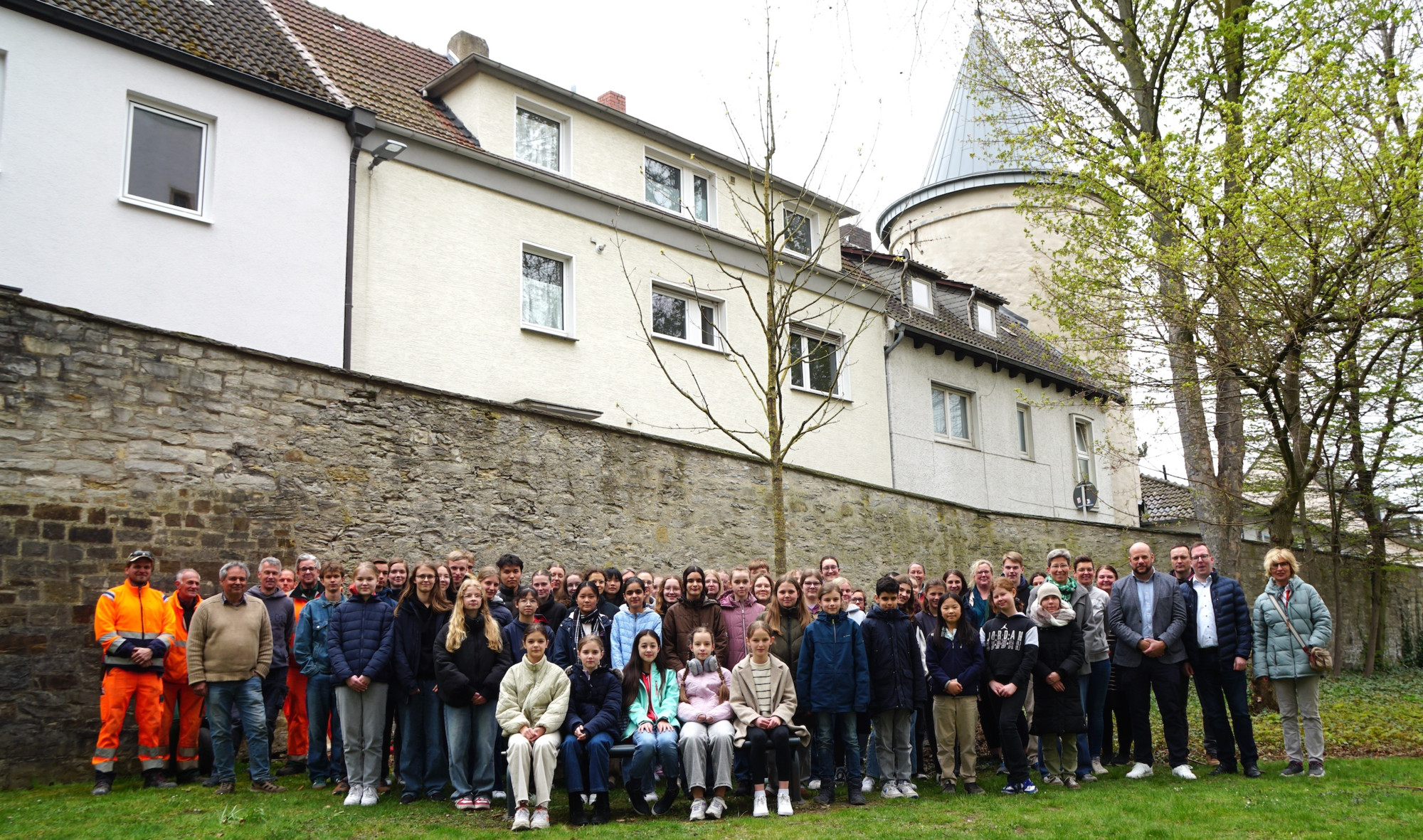 Nach der beeindruckenden und bewegenden Inszenierung des Musiktheaterstücks „Die Kinder der toten Stadt. Musikdrama gegen das Vergessen“ Ende März/Anfang April, das an das Schicksal der Kinder in Theresienstadt erinnert, fand das gleichnamige Schulprojekt nun mit einer Baumpflanzaktion seinen Abschluss. Im Garten der Theologischen Fakultät Paderborn in der Nähe der Mondsichel-Marienstatue pflanzten Schulleiterin Nicole Michaelis, die am Projekt beteiligten Lehrinnen und Lehrer sowie Professor Aaron Langenfeld, Rektor der Fakultät, und Fabian Güth, Quästor der Fakultät, einen Spitzahorn als „Baum wider das Vergessen“. Er soll den Opfern der nationalsozialistischen Verbrechen erinnern und die Lebenden mahnen, nicht zu vergessen und sich für Frieden, Freiheit und Demokratie einzusetzen wird zeitnah auf einer Gedenktafel zu lesen sein.