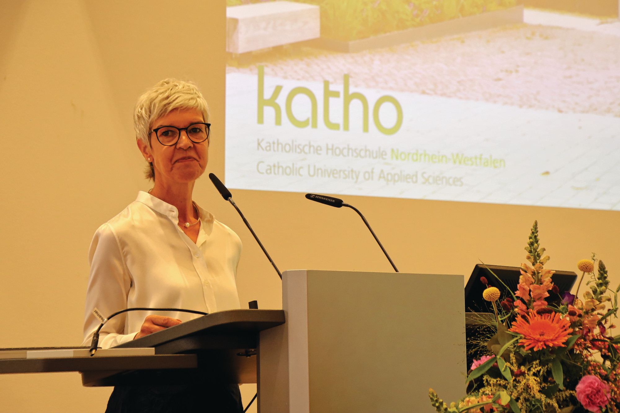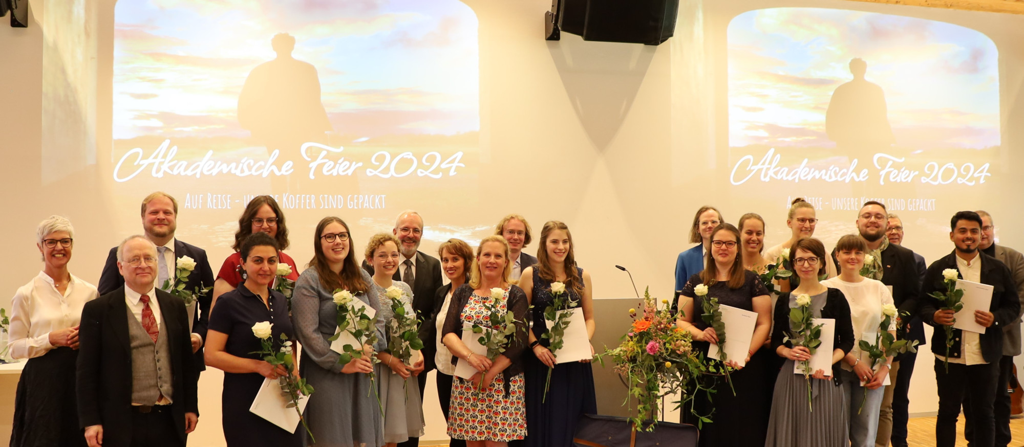 Zum Abschluss des Sommersemesters 2024 konnten 15 Absolventinnen und Absolventen der Angewandten Theologie ihr Bachelorzeugnis im Rahmen der Akademischen Abschlussfeier des Fachbereichs Theologie in Empfang nehmen. Die Dekanin des Fachbereichs Theologie, Prof.in Dr.in Bergit Peters, hieß zu Beginn des Festaktes die Absolventinnen, Absolventen, deren Angehörige und persönliche Gäste, sowie zahlreiche Ehrengäste aus dem Bereich Kirche, Politik und Gesellschaft, darunter Dompropst Monsignore Joachim Göbel, willkommen.