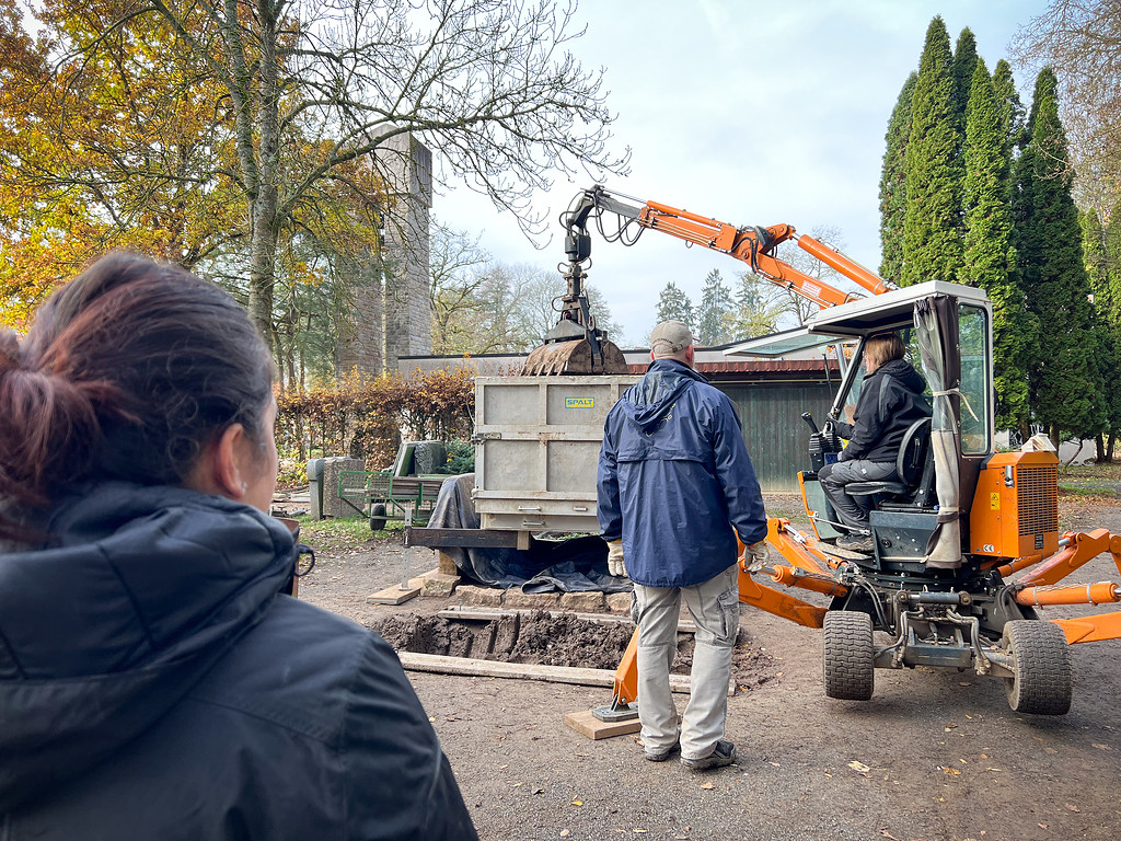 Wenn der Sarg oder die Urne einmal verschlossen sind, kommt in der Regel beides in ein Grab. Und das will ausgehoben werden. Das lernt an diesem Morgen eine andere Gruppe Azubis auf dem nach Angaben des Ausbildungszentrums weltweit einzigen Lehrfriedhof. Er liegt eine kurze Autofahrt entfernt von der Akademie direkt am städtischen Friedhof in Münnerstadt. Hier reihen sich echt aussehende, aber leere Gräber nebeneinander. Eine Stelle am Boden ist schon vorbereitet, um ein neues zu schaufeln und abzustützen. So können die Azubis unter realistischen Bedingungen üben.