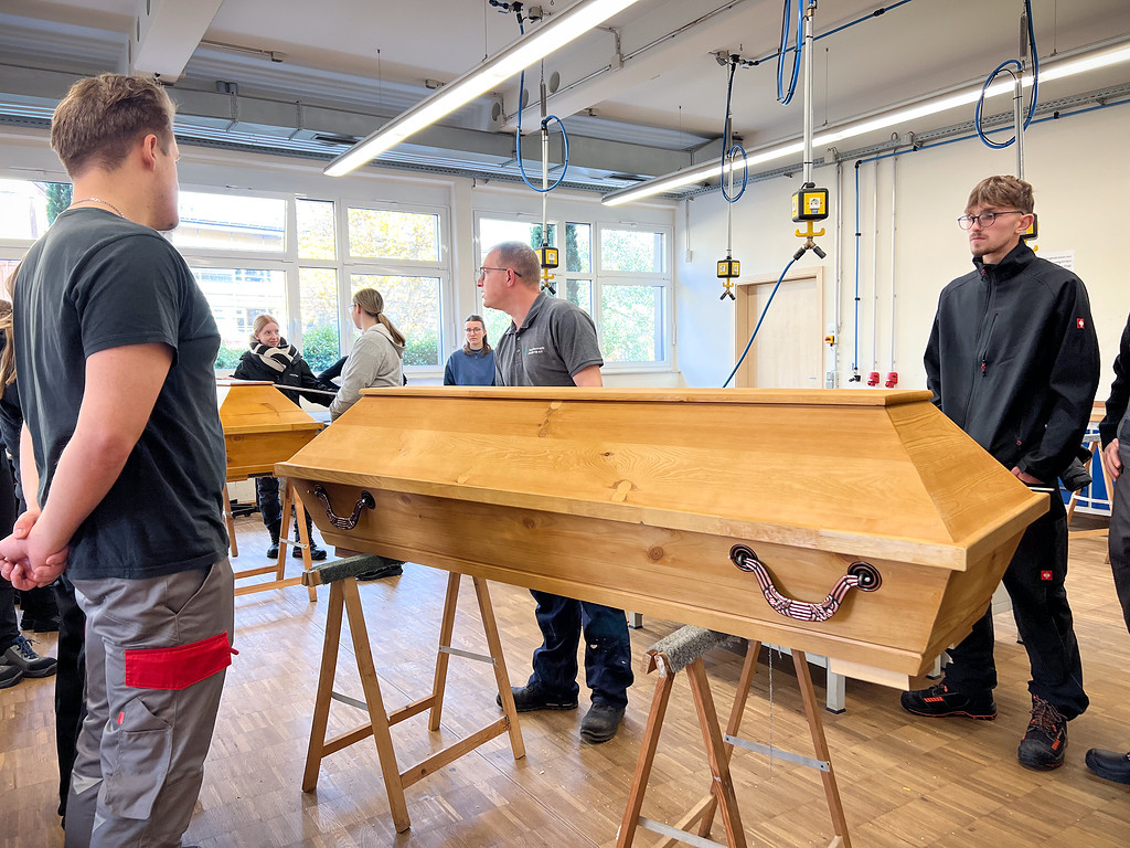 „Klack! Klack! Klack!“ Ein Luftdrucktacker ist an diesem Novembermorgen wohl das meistgenutzte Werkzeug im Werkstattraum der Theo-Remmertz-Akademie im unterfränkischen Münnerstadt. Heute lernen die Auszubildenden, einen Holzsarg auszukleiden. Überstehende Nägel werden mit Pappe abgedeckt, dann folgt eine Schicht Ölpapier, dann die weiche Sargmatratze. Jede Lage wird festgetackert, zum Abschluss folgt ein letzter Überzug: „Klack! Klack! Klack!“ Nun ist der Sarg bereit, um einen Leichnam auf dessen letzter Reise zu beherbergen. Die Särge werden später für echte Beerdigungen verwendet.