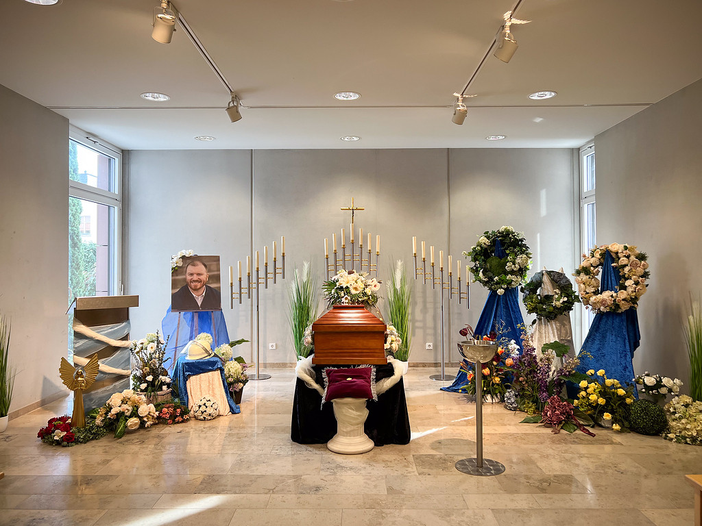 Um all das in der Praxis zu lernen, steht den Auszubildenden in der Akademie eine „Übungskapelle“ zur Verfügung – ein Raum, den sie für fiktive Trauerfeiern dekorieren. Braucht man Weihwasser oder ein Kreuz? Welche Hobbys oder Vorlieben hatte der Verstorbene? Um das bei Trauerfeiern abbilden zu können, können sie sich in einem großen Lagerraum bedienen: Urnen, Kerzen, Kreuze, verschiedene Deko-Elemente und eine große Auswahl an Kunstblumen warten hier auf ihren Einsatz.
