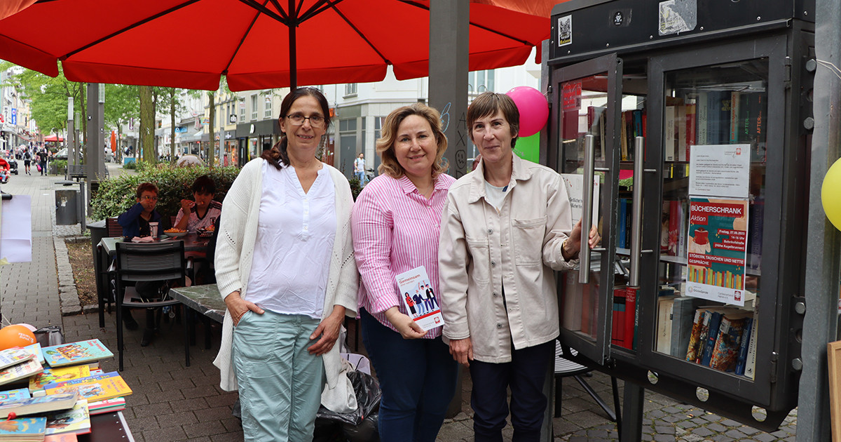 Die Büchertauschbörse des Herner Caritasverbandes fand bereits zum dritten Mal statt. Bücherschrankpatin Ina Meyer und das Caritas-Team kamen schnell mit den Besuchern ins Gespräch und berieten auf Wunsch bei der Buchauswahl. Meyer kümmert sich seit fünfeinhalb Jahren ehrenamtlich um den ordentlichen und gut sortierten Zustand des Bücherschranks auf der Bahnhofstraße