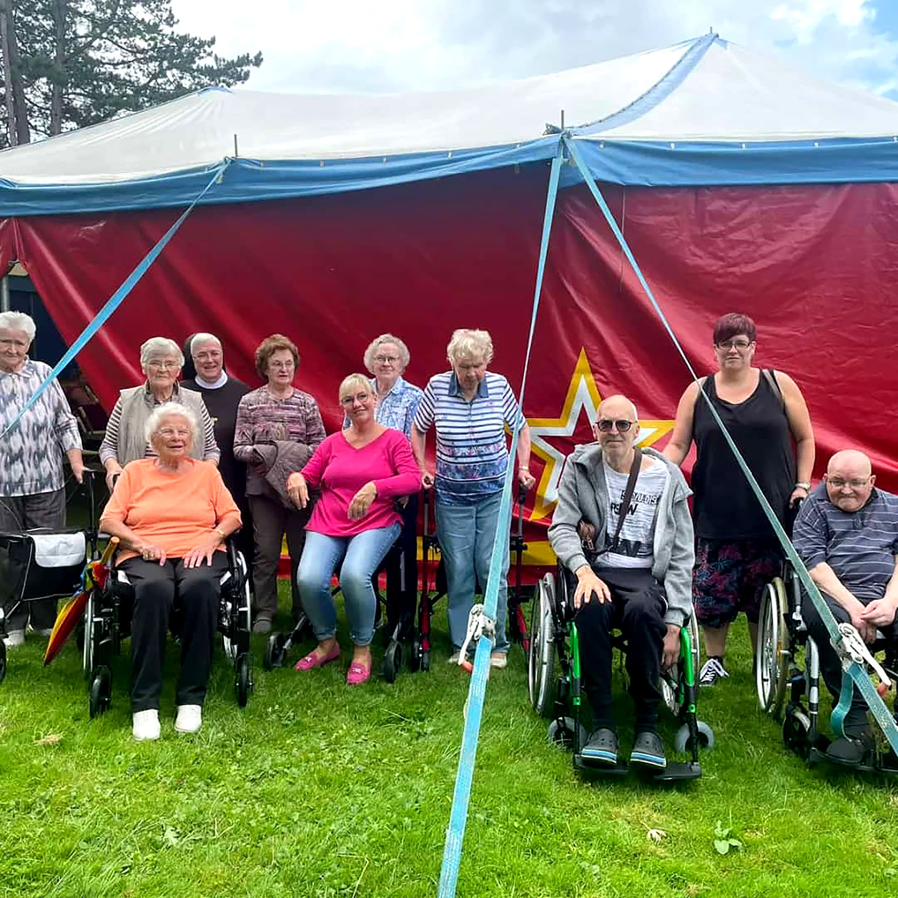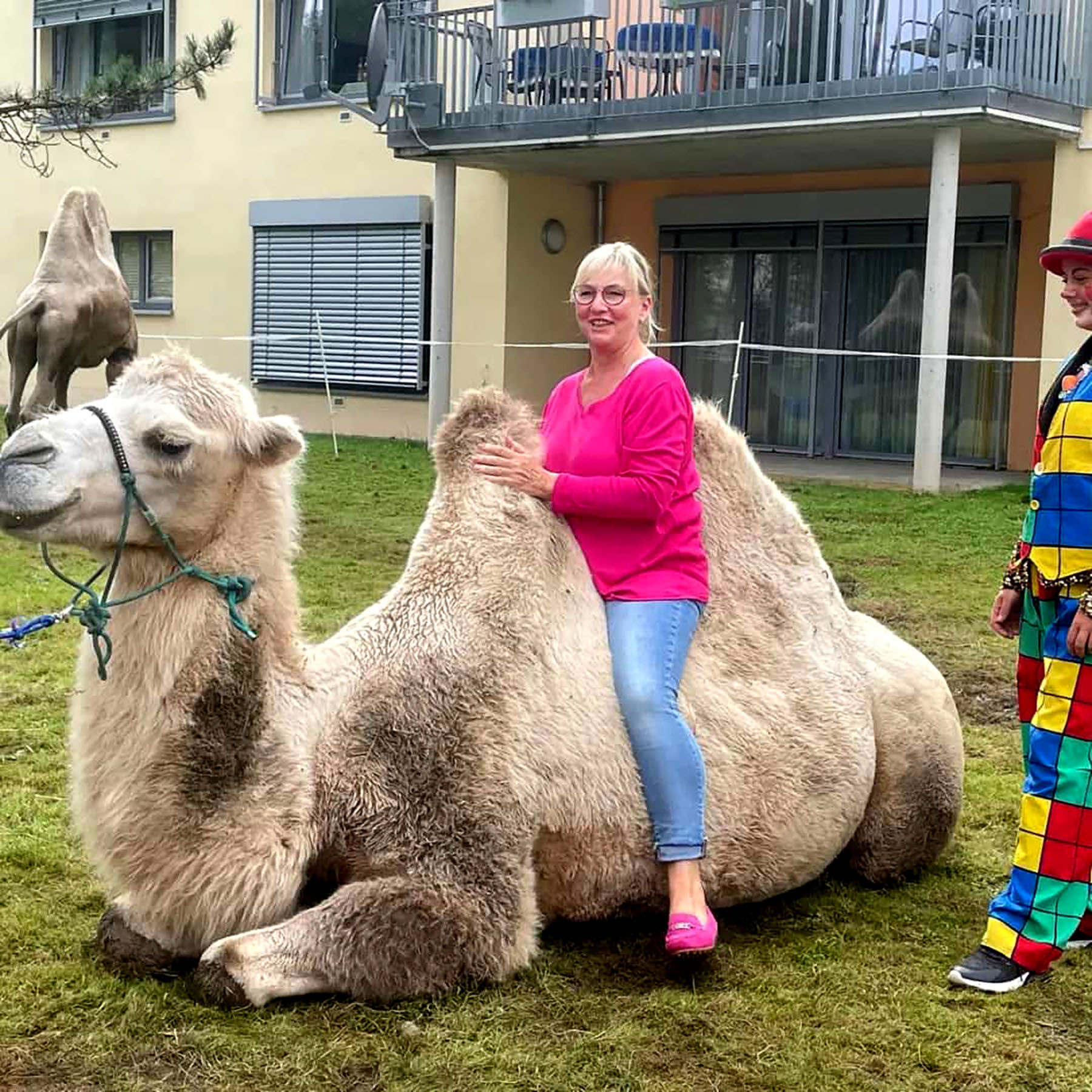 GrundtextMit Kamelen im Garten und einem Zirkuszelt vor dem Haus war der Kult Circus Renz eine ganz besondere Attraktion für die Bewohnerinnen und Bewohner des Altenheims St. Franziskus in Marsberg-Beringhausen. Das Circus-Familienunternehmen gastierte vom 12. bis zum 18. August vor dem Altenheim St. Franziskus und nutzte das große begrünte Außengelände auch für den Auslauf seiner Tiere. So konnten die Bewohnerinnen und Bewohner von ihren Fenstern aus direkt Lamas und Ziegen, Ponys, Pferde und Hunde sowie die drei mongolischen Kamele beobachten, die besonders bewundert wurden.