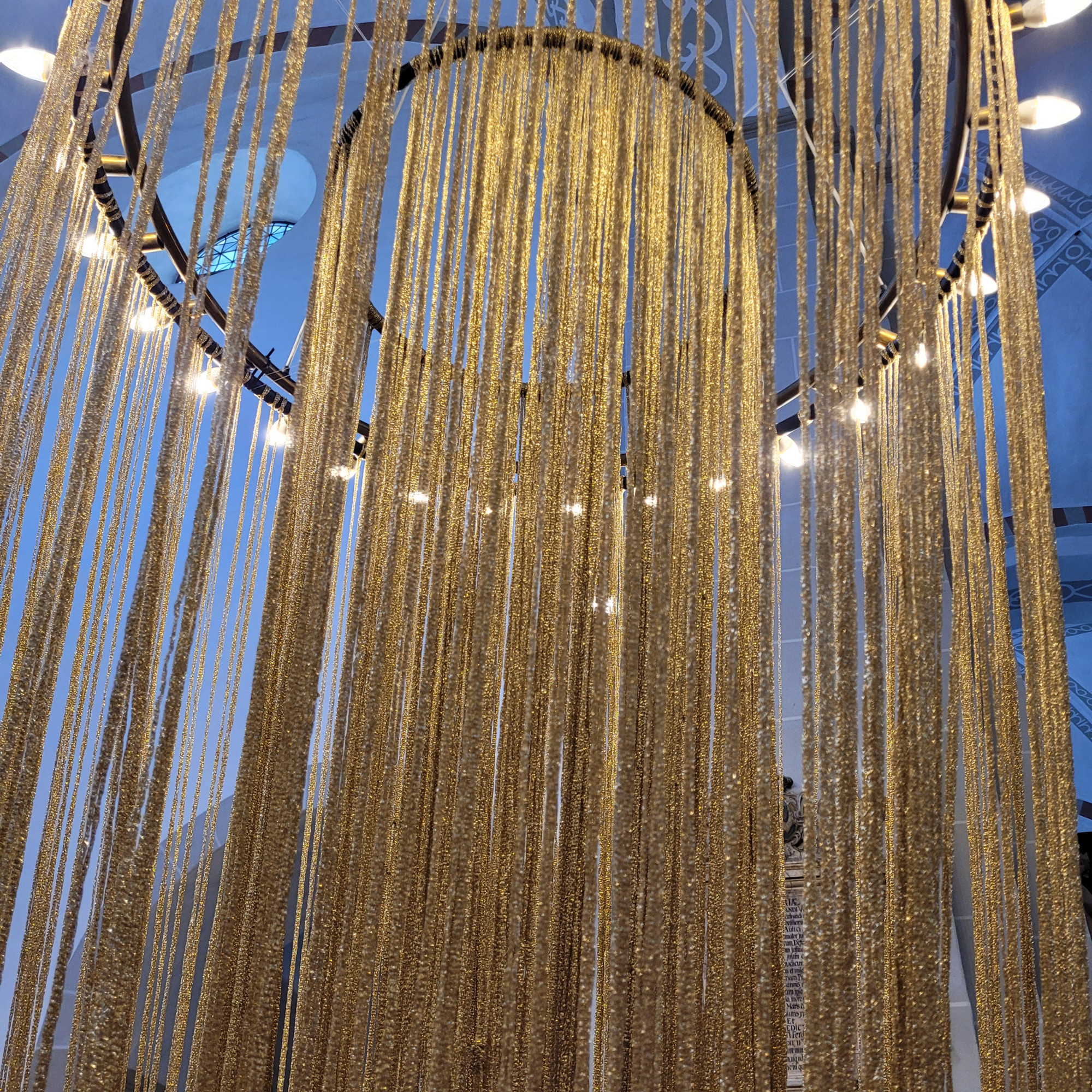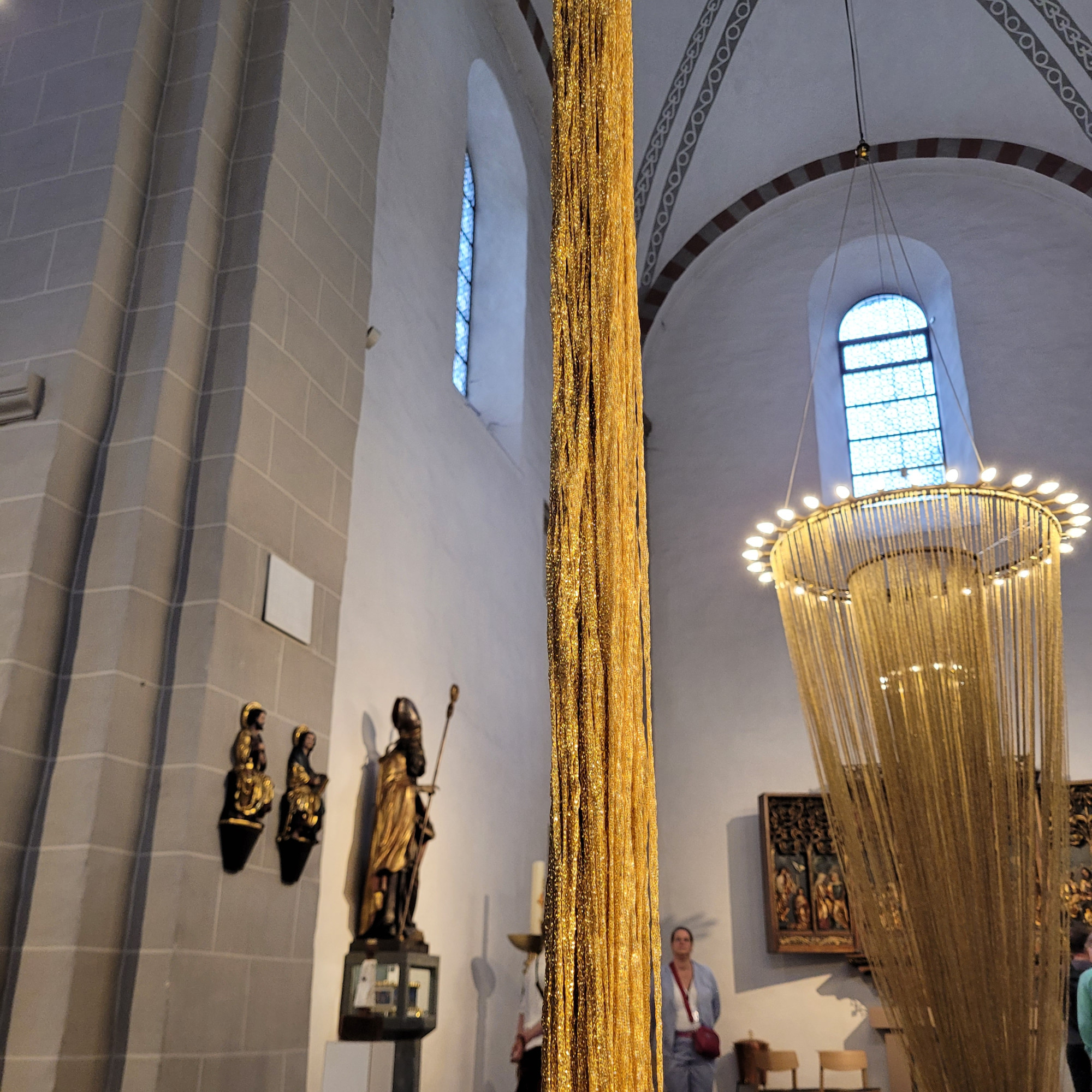 Und dann, mit dem Verlassen des Tunnels eine weitere Einladung zum Staunen: der Lichtregen, unzählige goldene Fäden. Gespannt waren diese an verschiedenen Stellen, am Kreuz, über dem Taufbecken und an anderen Stellen vor dem Altarraum. Sogar aus der Kirchendecke floss ein Strahl Gold. Der Textilkunstgruppe „tx02“ aus Meschede war es gelungen, zu inspirieren und zu guten Gedanken anzuregen. „Die goldenen und silbernen Fäden nehmen dem Kreuz die Schwere“, so ein Kommentar eines Besuchers. „Die Überfülle an Goldfäden im Taufbecken lässt Gottes überreiche Liebe zu uns erahnen“ – ein weiterer Gedanke.