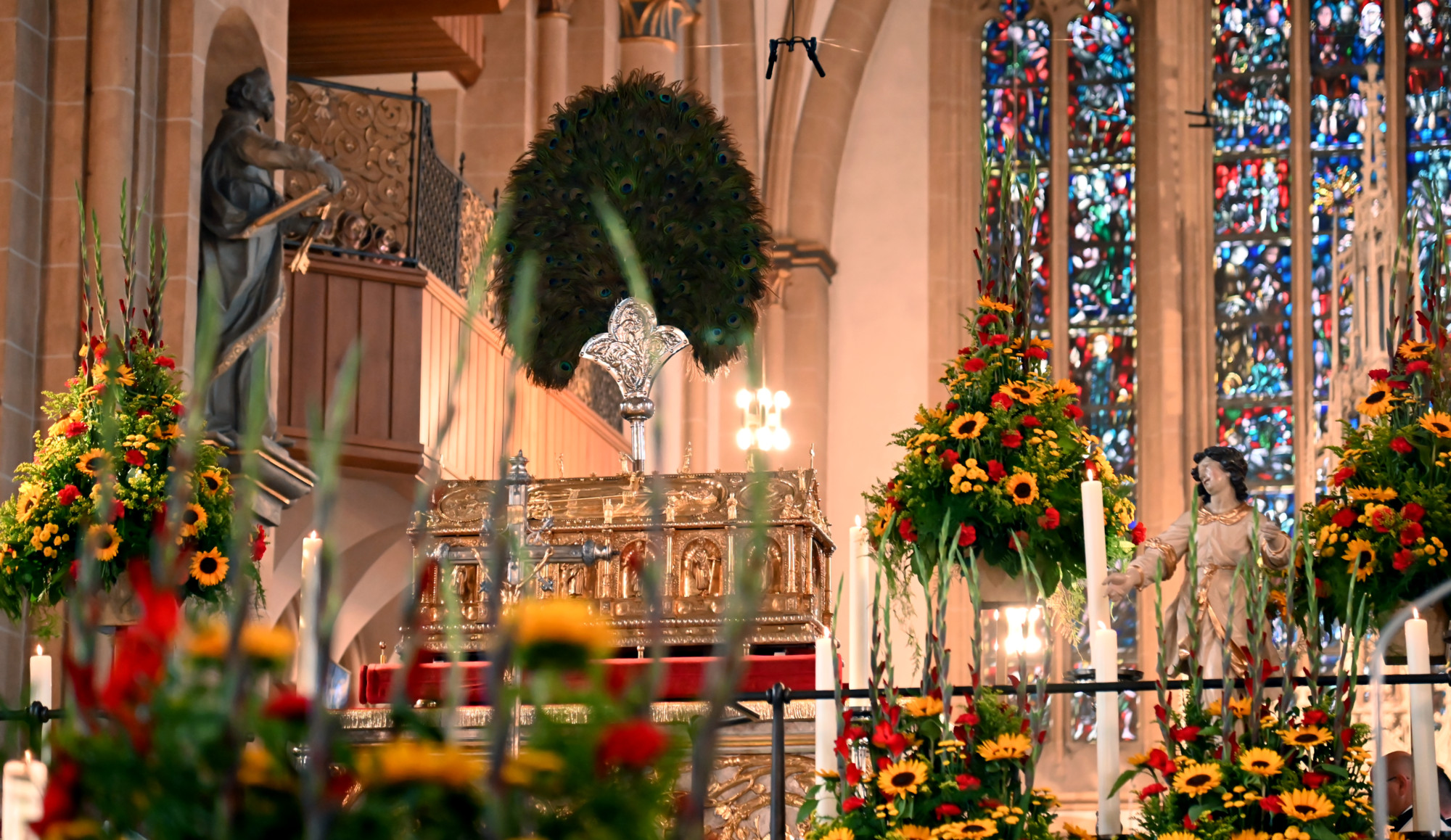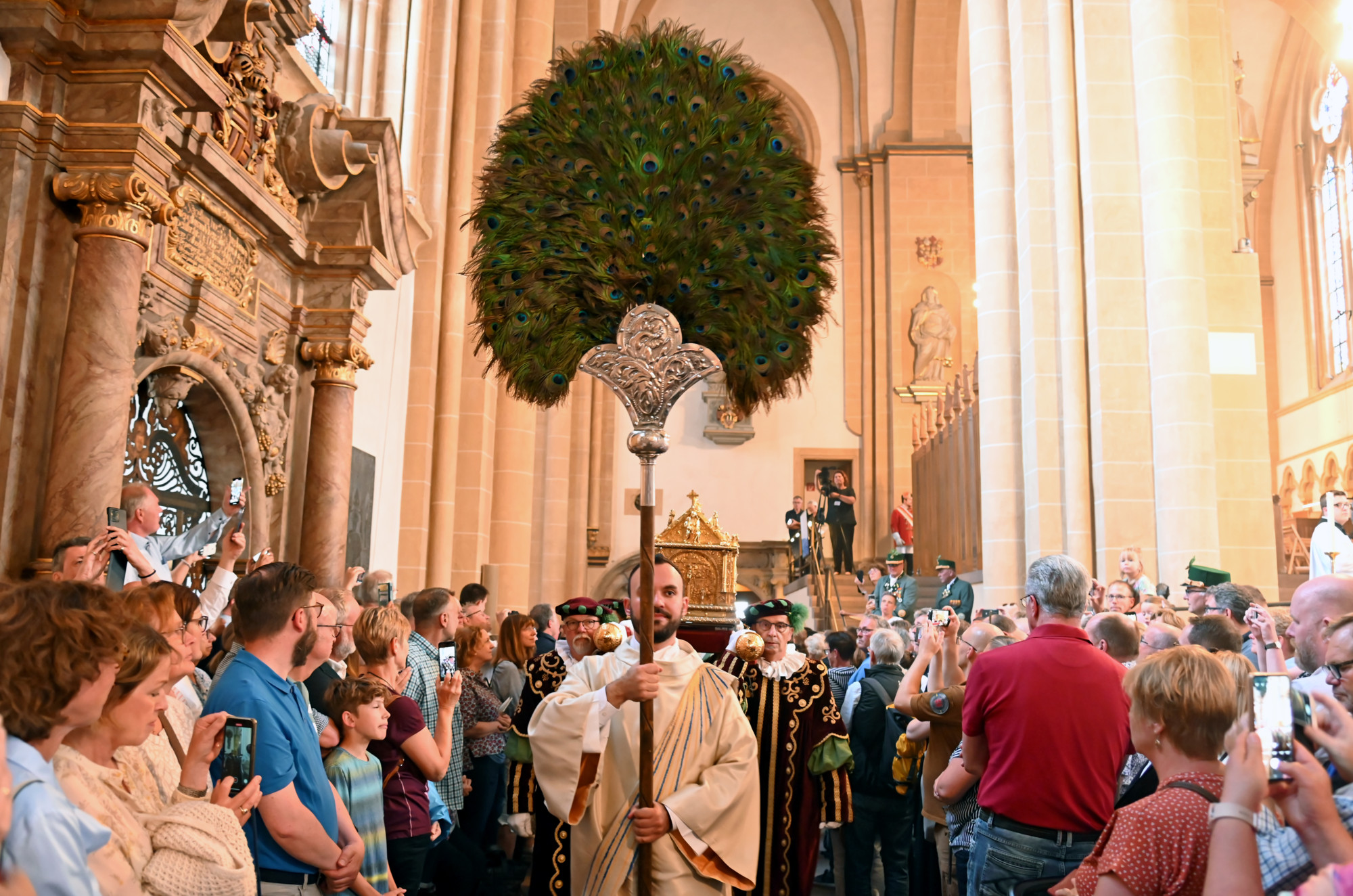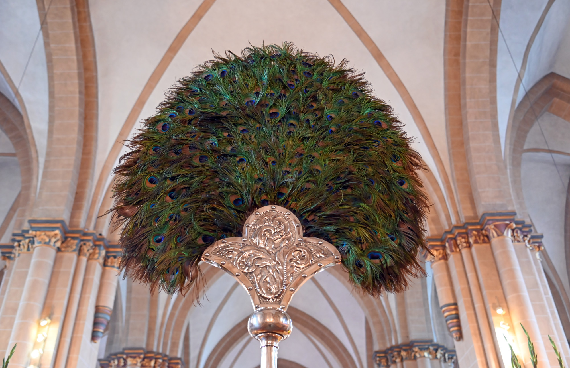 Während der Prozessionen mit dem Schrein des heiligen Liborius wird diesem ein Pfauenschweif vorausgetragen. Ein Pfauenschweifträger wird erstmals 1483 in den Statuten der städtischen Verwaltung Paderborns schriftlich bezeugt. Der Brauch, dem Schrein einen Pfauenwedel voran- zutragen, ist aber weitaus älter. Möglicherweise lernte die Paderborner Delegation, die 836 die Gebeine des heiligen Liborius aus Le Mans holte, dort die Tradition eines Fächers aus Pfauen- federn kennen und brachte sie mit nach Paderborn. Nachdem der Pfauenfederschweif 1945 aufgrund der Bombenangriffe auf den Dom und die Stadt verbrannt war, trieb der Paderborner Goldschmied Joseph Fuchs 1948 erneut eine Halterung aus Silber, die der vorherigen gleicht. 1988 wurde der Pfauenschweif mit ca. 600 Pfauenfedern neu bestückt. Der Hohe Dom kann mit Stolz auf die nahezu 1200-jährige beständige Tradition der Nutzung des Pfauenwedels blicken, weil er die einzige Kirche des Abendlandes ist, in der solch ein Pfauenwedel in der Liturgie Verwendung findet.