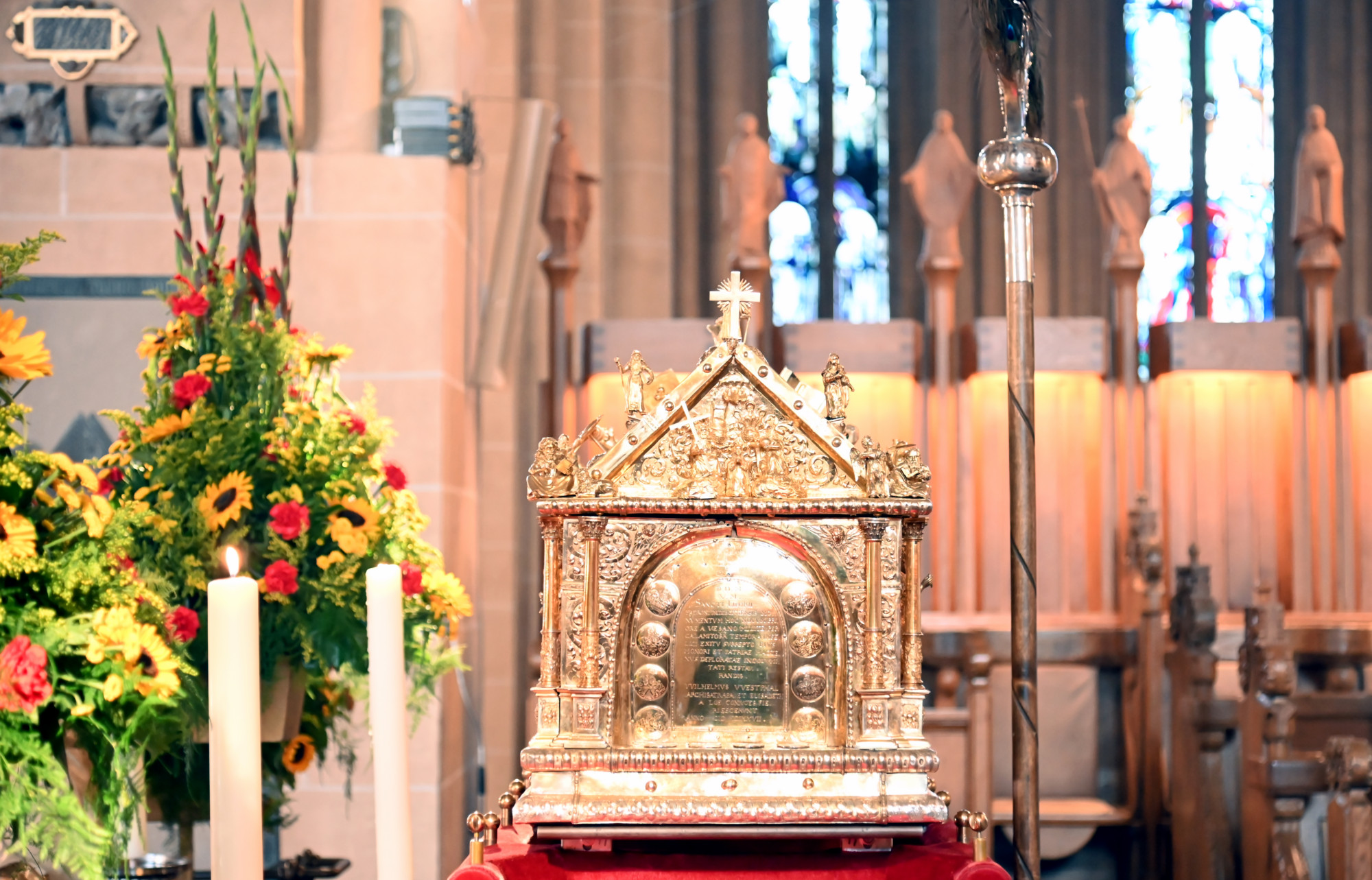Das Metropolitankapitel, das Erzbistum und die Stadt Paderborn sind zu Recht stolz auf den Li- borischrein. Seine bleibende Bedeutung bezieht er nicht allein und primär aus seinem Alter und seiner künstlerischen Qualität, sondern aus der Bestimmung, für die er gestiftet und geschaffen wurde: die Reliquien des heiligen Dom-, Bistums- und Stadtpatrons Liborius aufzunehmen und die Auferstehung der Glaubenden mit allen Heiligen des Himmels zu bezeugen.