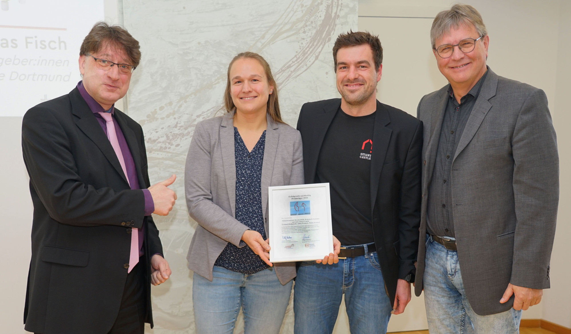 Ausgezeichnet wurde die Möbelwerkstatt Breckerfeld und Kukatsch Systeme. Gründer Eckhard Kukatsch sowie seine Tochter Alina Frenzel und ihr Mann Malte Frenzel überzeugten die Jury mit ihrem innovativen Projekt „Smart Castles“. Seit 2021 entwickelt das Unternehmen modulare Holzhäuser auf Basis regional angebauten Vollholzes. Die Jury würdigt damit ein „zukunftsweisendes, innovatives Konzept, das neue Wege im Bau erschließt“.