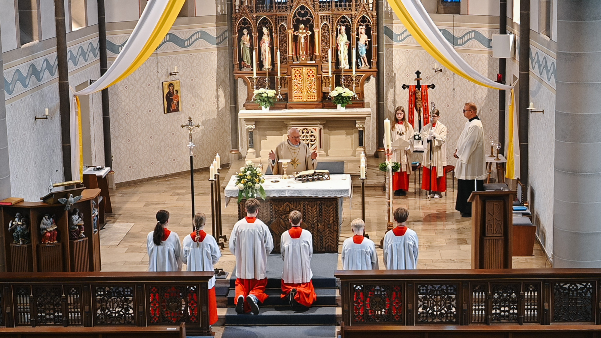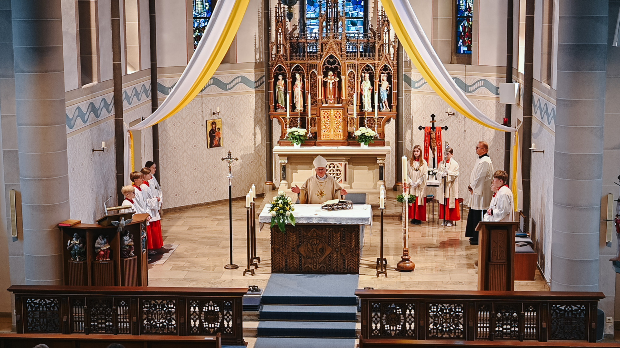 Ausgehend vom biblischen Psalm 150, aus dem auch sein bischöflicher Wahlspruch „Alles, was atmet, lobe den Herrn. Halleluja!“ entnommen ist, erinnerte Weihbischof Hubert Berenbrinker beim Pontifikalamt in der Pfarrkirche St. Fabian und St. Sebastian in Giershagen daran, dass Gott „alles“ wunderbar geschaffen habe. Menschen seien aufgerufen, sich an der ihnen von Gott anvertrauten Schöpfung zu erfreuen und dankbar zu sein für Gottes Heilshandeln in der Geschichte.