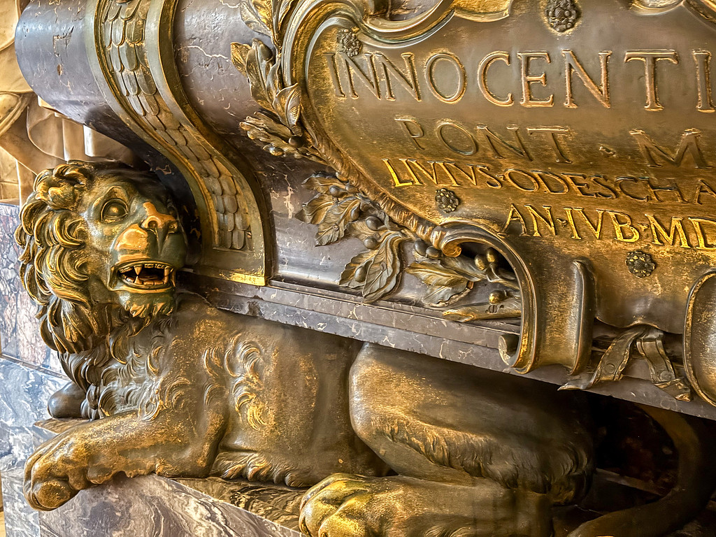 Innozenz XI. (1676-1689) ist einer der Päpste, die zur Verbreitung des „Königs der Tiere“ beitrugen: Sein Grabmal im linken Seitenschiff wird getragen von zwei bronzenen Löwen. Auch das Monument für Clemens XIII. (1758-1769) nahe den Beichtstühlen am rechten Querschiff wird von zwei Löwen bewacht.