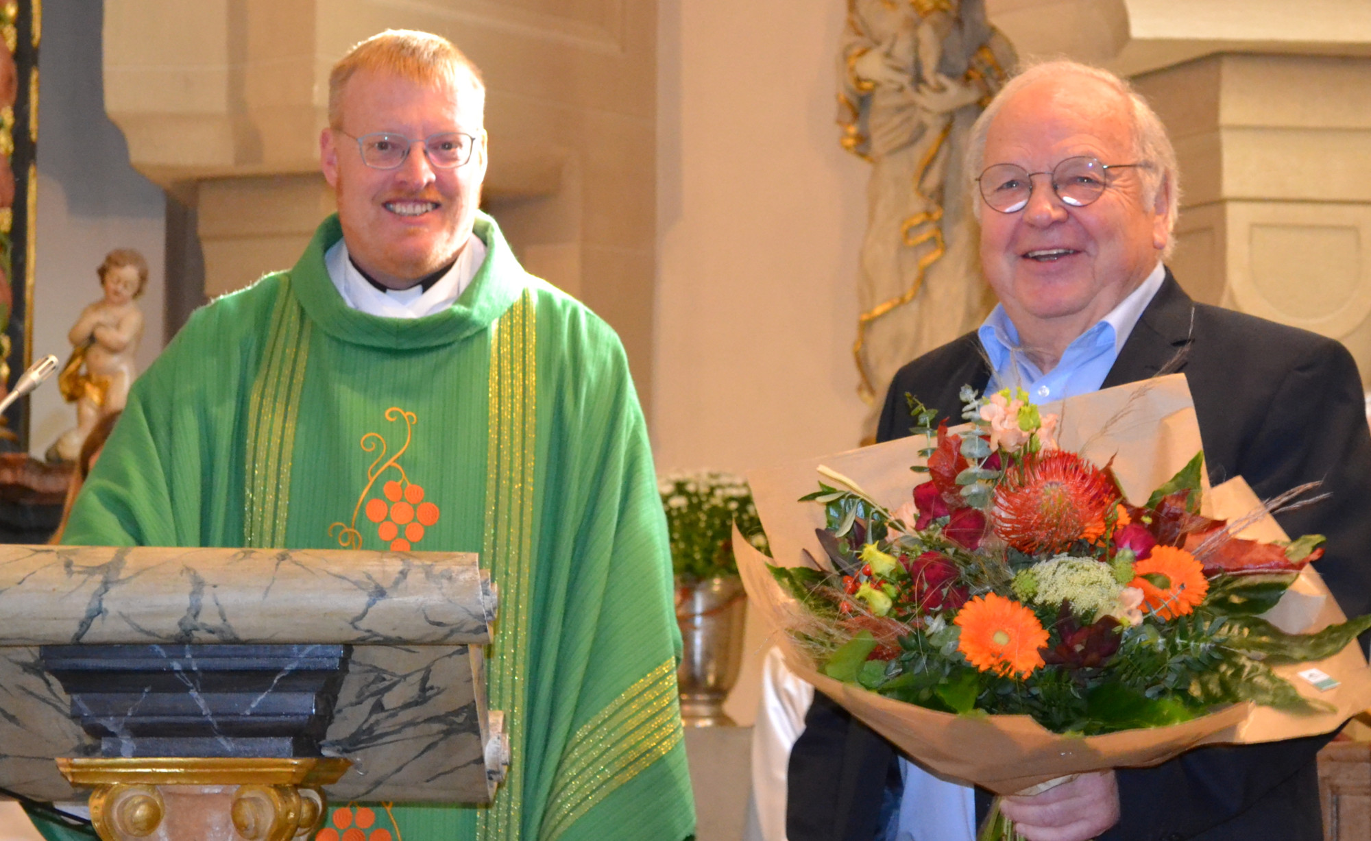 Zu Beginn der Erntedank-Festmesse segnete Diakon Klaus Henkenherm die Erntegaben und die Erntekrone, die in der Kirche aufgebaut waren. Pastor Alexander Plümpe erarbeitete in seiner Predigt mit der Gemeinde in dialogischer Form das Sprichwort: „Wer singt, betet doppelt – und kann so Gott loben und ihm danken“ Und so wurde viel gesungen und viel gebetet. Am Ende der Messe rief Pastor Plümpe den Organisten nach vorn zum Altar, was die Gemeinde mit großem Applaus begleitete.