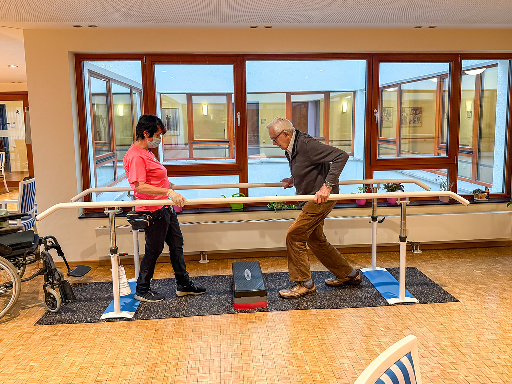 „Ich hole mir die Beweglichkeit zurück“, das habe sie damals nach dem Schlaganfall gedacht, sagt Eva N. „Man muss den Willen haben und den Hintern hochkriegen.“ Sie steht aus dem Rollstuhl auf und geht mit kleinen Schritten durchs Zimmer, setzt konzentriert immer einen Fuß nach dem anderen auf.
