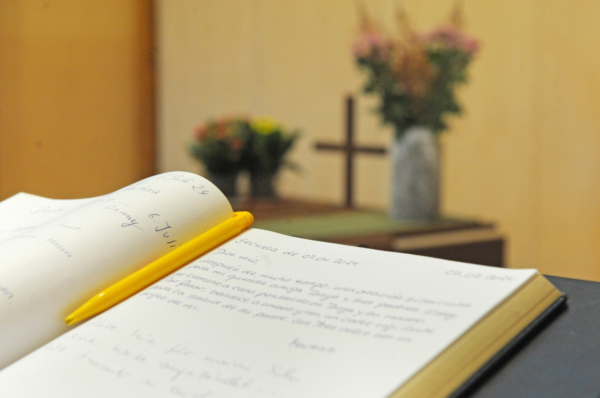 Übrigens ist die Kapelle nicht die erste ökumenische Einrichtung für Reisende an diesem Ort: 1953 entstand dort die Autobahnmission. Zwei Fürsorgerinnen der Caritas und der Inneren Mission kümmerten sich damals um die zahlreichen, nicht gerade willkommenen Tramper an der Raststätte.Ein junger Mann verlässt die Kapelle gerade. Mit dem Kaffeebecher in der Hand und den Tätowierungen auf den Unterarmen sieht auch er nicht aus wie ein typischer Kirchgänger. Er lächelt und hält die Tür auf. Vielleicht war er es, der in dem „Anliegenbuch“, das aufgeschlagen neben dem Altar liegt, die letzte Eintragung gemacht hat. Um zu lesen, was er geschrieben hat, muss man allerdings Spanisch können.