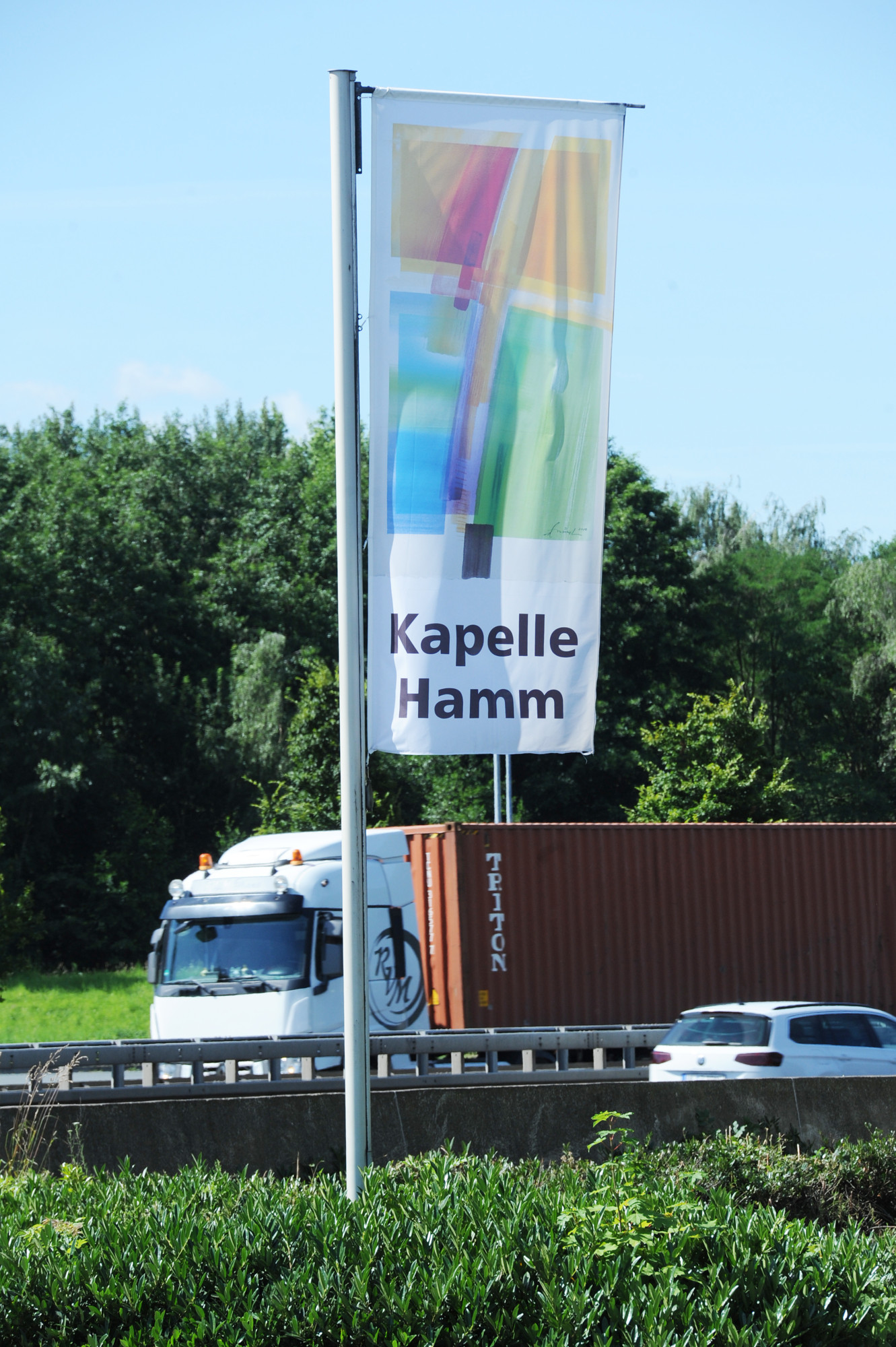 Eine Gruppe junger Leute nutzt die Pause, die ihr Bus macht, um ein bisschen auf dem Parkplatz zu kicken. Keine gute Idee, findet offensichtlich ein Lkw-Fahrer, der die drei mit seiner Hupe von der Fahrbahn scheucht. Zwei Jugendliche haben sich auf den Weg gemacht, um das Gebäude am Ende des Rastplatzes genauer in Augenschein zu nehmen. Als sie das Schild „Autobahnkapelle“ lesen, stocken sie. Reingehen oder nicht? Sie entscheiden sich dagegen. Dass das Gebäude eine kirchliche Einrichtung beherbergt, ist abgesehen vom Schild direkt neben dem Eingang nur noch anhand einer Fahne mit der Aufschrift „Kapelle Rhynern“ zu erschließen. Doch die übersieht man trotz ihrer Größe schnell.