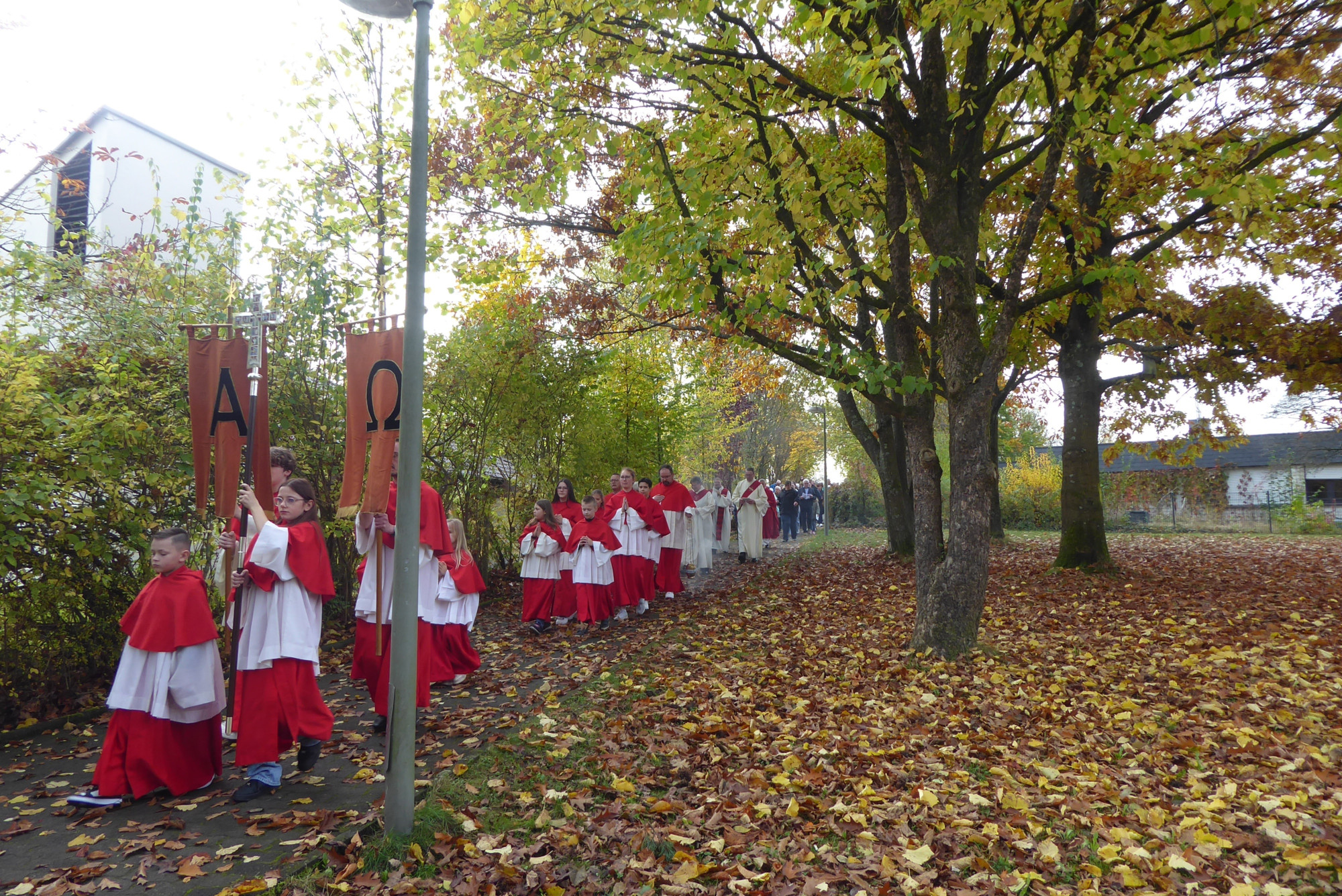 Vor drei Jahren war der Dachstuhl in Flammen aufgegangen und hatte das Gebäude zu einem großen Teil zerstört. Einzig der Altarraum der Kapelle blieb unberührt. Die Wiedereröffnung begann auf dem Schulhof der Hammerhütter Schule, einer katholischen Bekenntnisschule der Stadt Siegen, wo Pfarrer Ludwig Reffelmann das Wasser segnete. Dann setzte sich die Prozession in Bewegung.