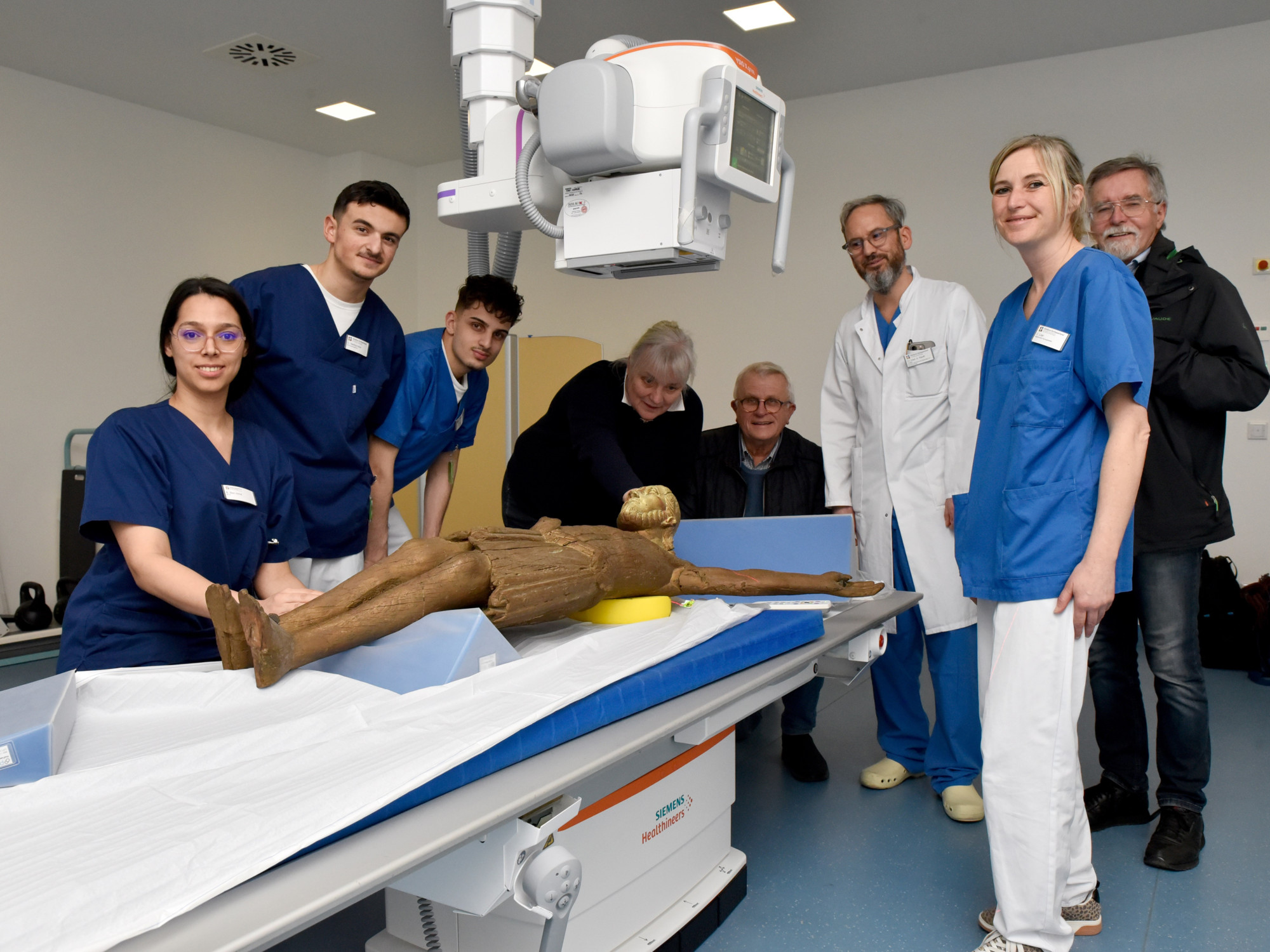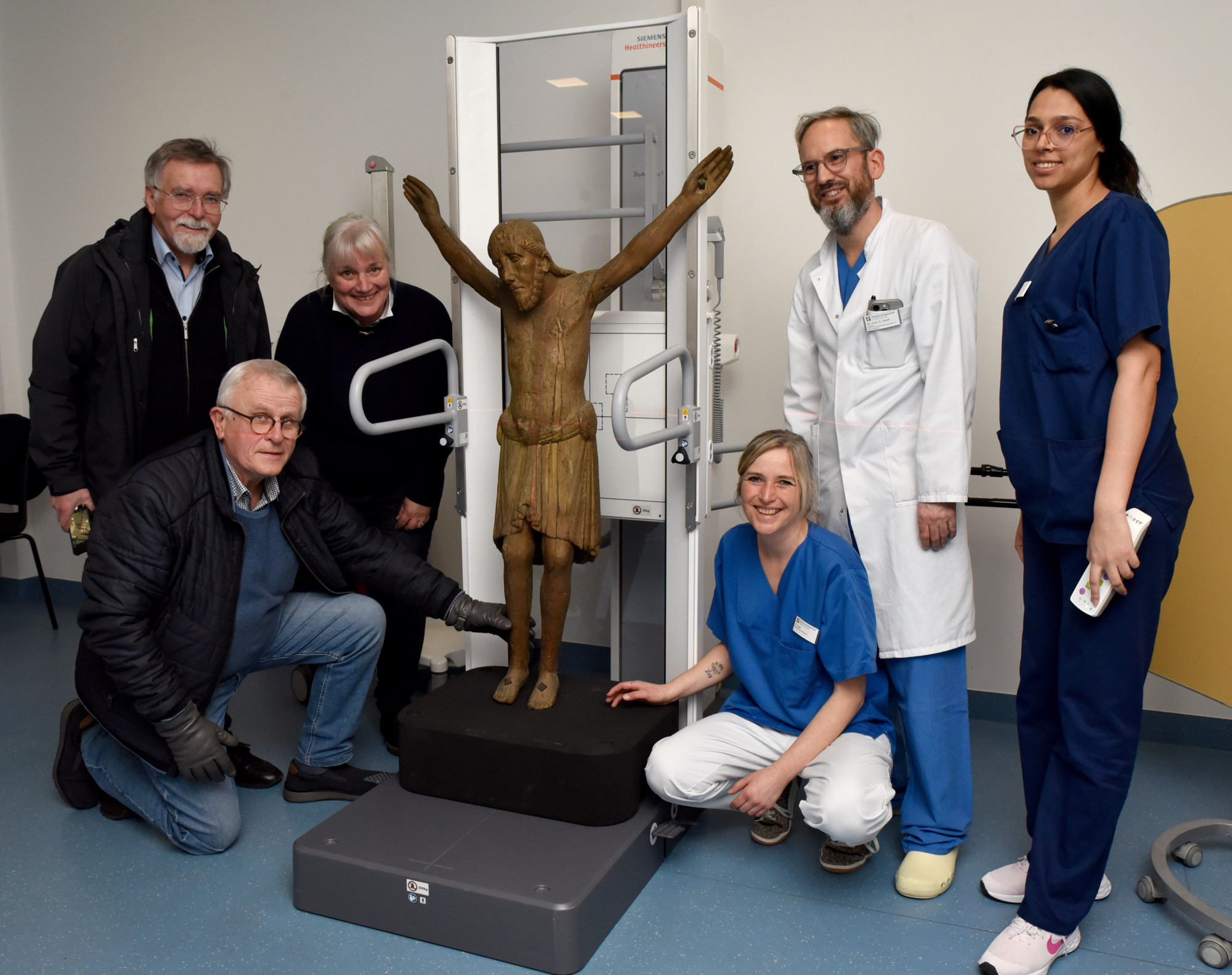 „Wir wissen, dass der über 850 Jahre alte Korpus bereits eine bewegte Geschichte hinter sich hat und im Sauerland einzigartig ist“, beschreibt Denkmalpflegerin Dr.-Ing. Bettina Heine-Hippler. Aus dem Jahr 1921 gibt es die Rechnung eines Neheimer Schreinermeisters, der den Korpus unter anderem gebeizt und poliert hat. Vor allem aber die heutige Haltung der Arme und die Befestigung am alten romanischen Kreuz aus der Oelinghauser Klosterkirche gaben der LWL-Forscherin sowie Freundeskreis und Gemeindeteam noch viele Fragen auf. Diese zu klären war nun die spannende Herausforderung u. a. für Annika Hoffmann, Luca Pace und Dimitrios Vasilopoulos, alle Auszubildende der Fachrichtung Medizinische Technologin / Medizinischer Technologe für Radiologie im ersten Lehrjahr, die die Röntgenuntersuchung vornahmen. „Durch diesen Fall wurden unsere Auszubildenden mit ungewöhnlichen Fragen konfrontiert, die im Rahmen der Ausbildung jedoch eine wichtige Bedeutung haben“, sagt Chefarzt Dr. Alexander Ranft.