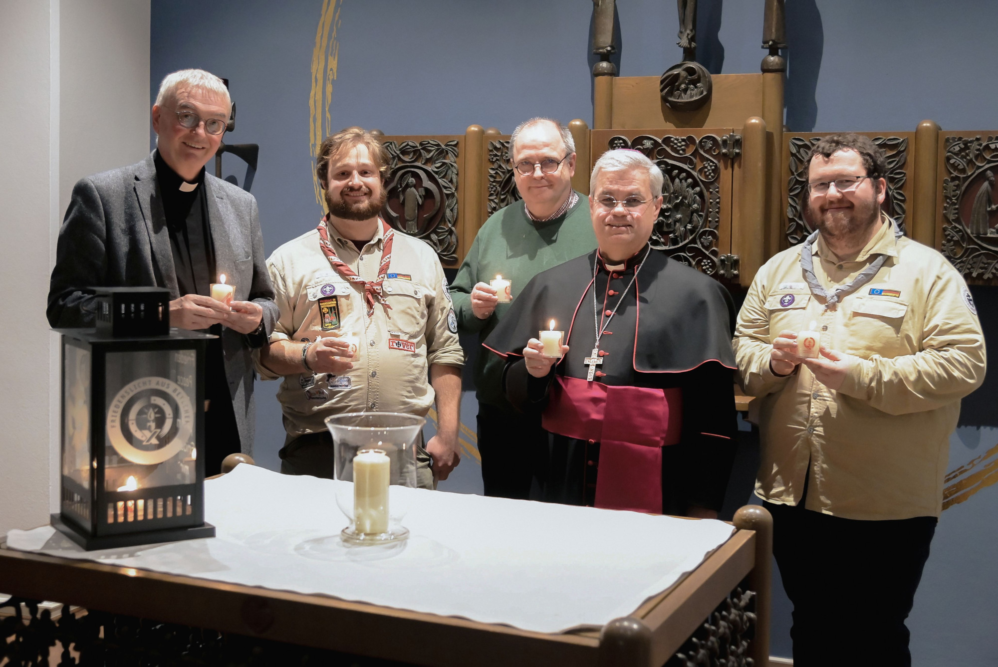 Die DPSG-Delegation hatte das Licht mit ihrer Laterne vor ihrem Besuch im Bischofshaus auch in den Paderborner Dom getragen. Biber und Wölflinge des Pfadfinder-Stamms St. Meinolf aus Paderborn hatten zwei selbstgestaltete Kerzen in die Paderborner Bischofskirche mitgebracht – die erste davon entzündeten die jungen Pfadfinderinnen und Pfadfinder mit der Flamme des Friedenslichts. „Das Friedenslicht hat eine weite Reise hinter sich. Wir sind froh, es wieder im Dom zu haben“, sagte Dompastor Matthias Klauke, der mit allen darum betete, dass das Licht sich verbreiten möge.
