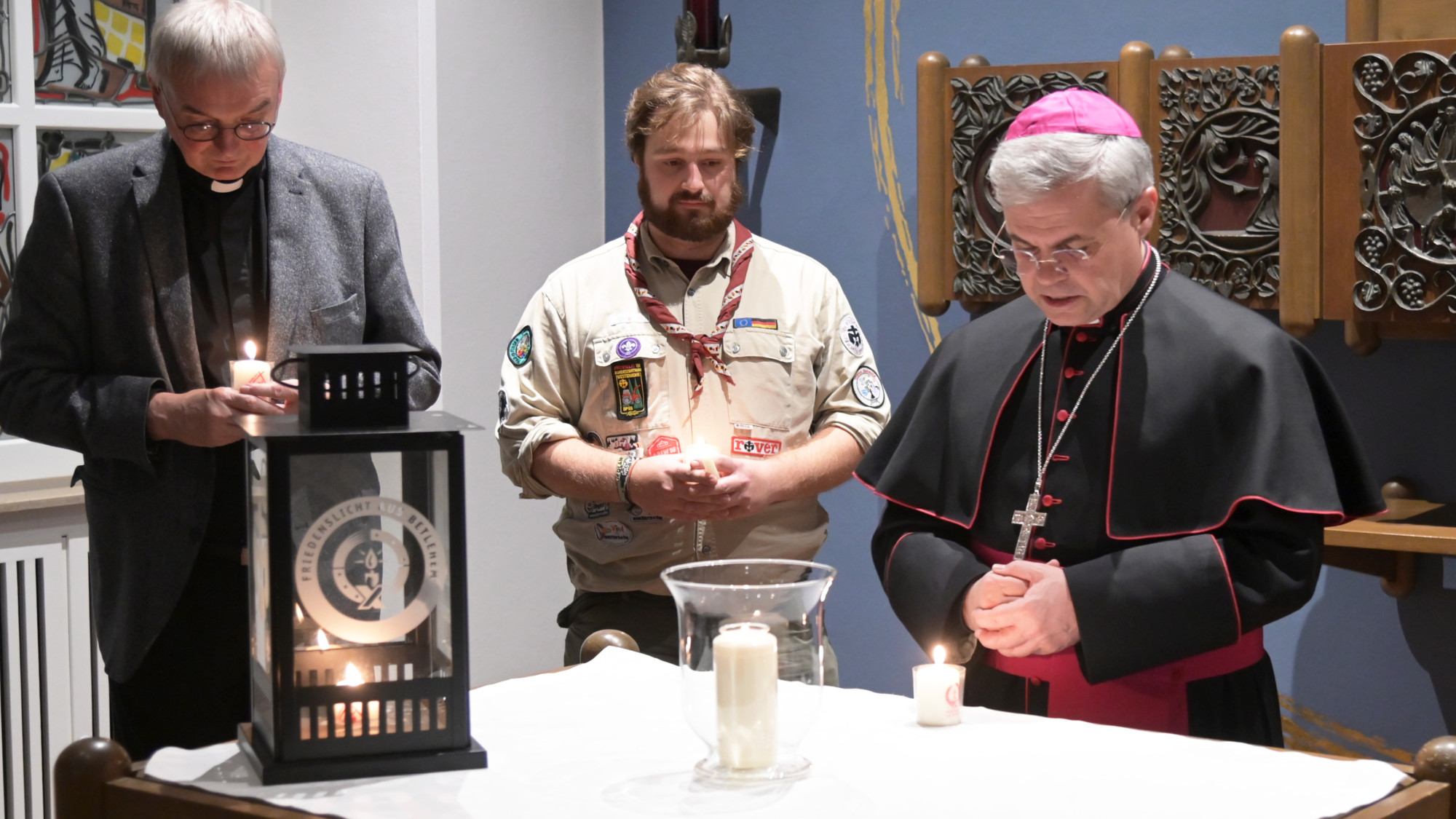 Am Sonntagabend erreichte das Friedenslicht auch Paderborn: Hier breitete sich das Licht zunächst beim WDR 2 Weihnachtswunder aus, das im gläsernen Sendestudio und mit Live-Musik derzeit viele Menschen für den guten Zweck zusammenbringt. Am Montag trugen Diözesankurat Thorsten Hasse und Benedikt Janssen vom DPSG-Diözesanvorstand Paderborn das Friedenslicht schließlich zu Erzbischof Dr. Udo Markus Bentz und Generalvikar Prälat Thomas Dornseifer. Der Paderborner Erzbischof nahm das Friedenslicht in der Kapelle des Bischofshauses entgegen, wo er gemeinsam mit den Pfadfindern eindringlich um Frieden in der Welt und untereinander betete.