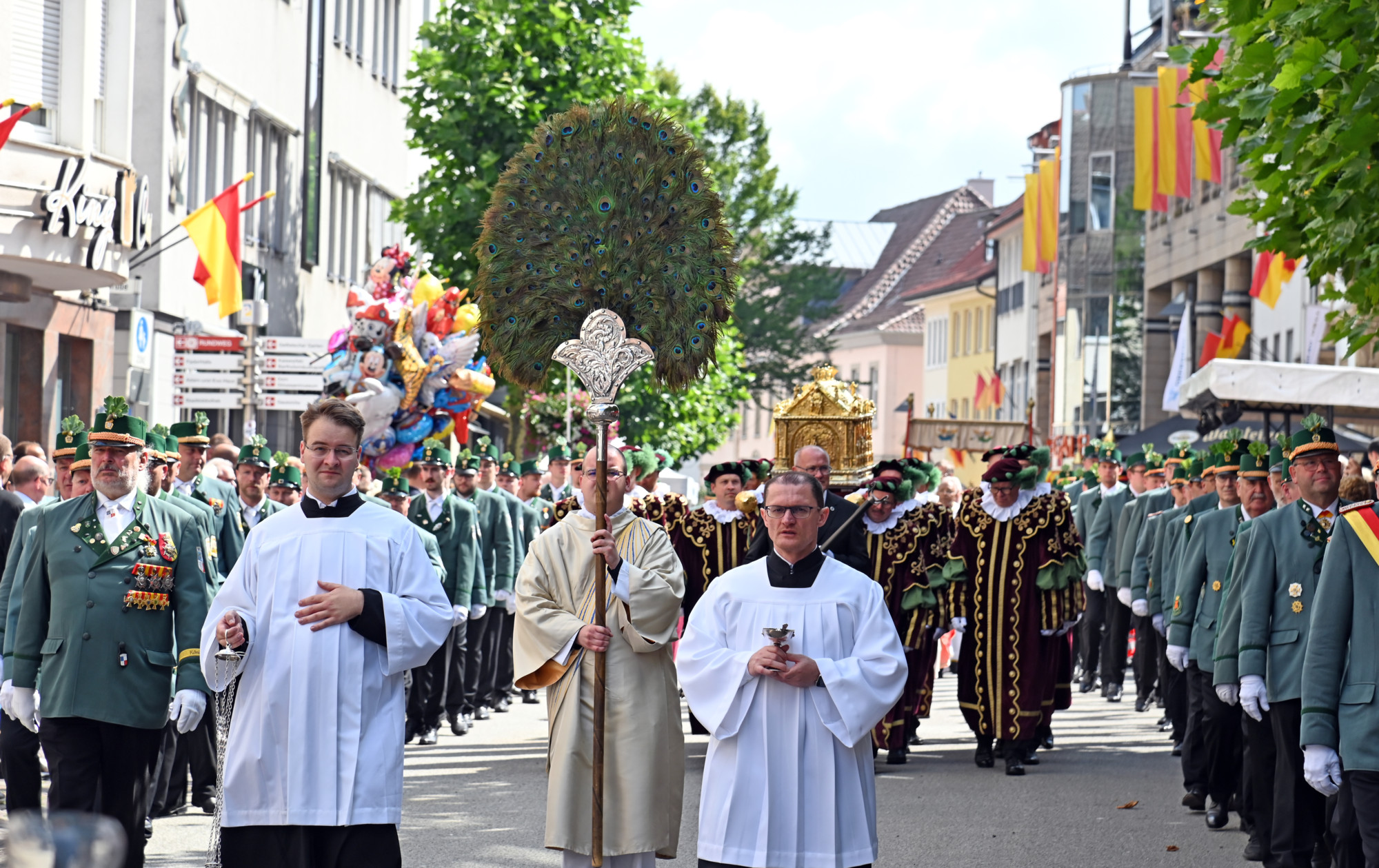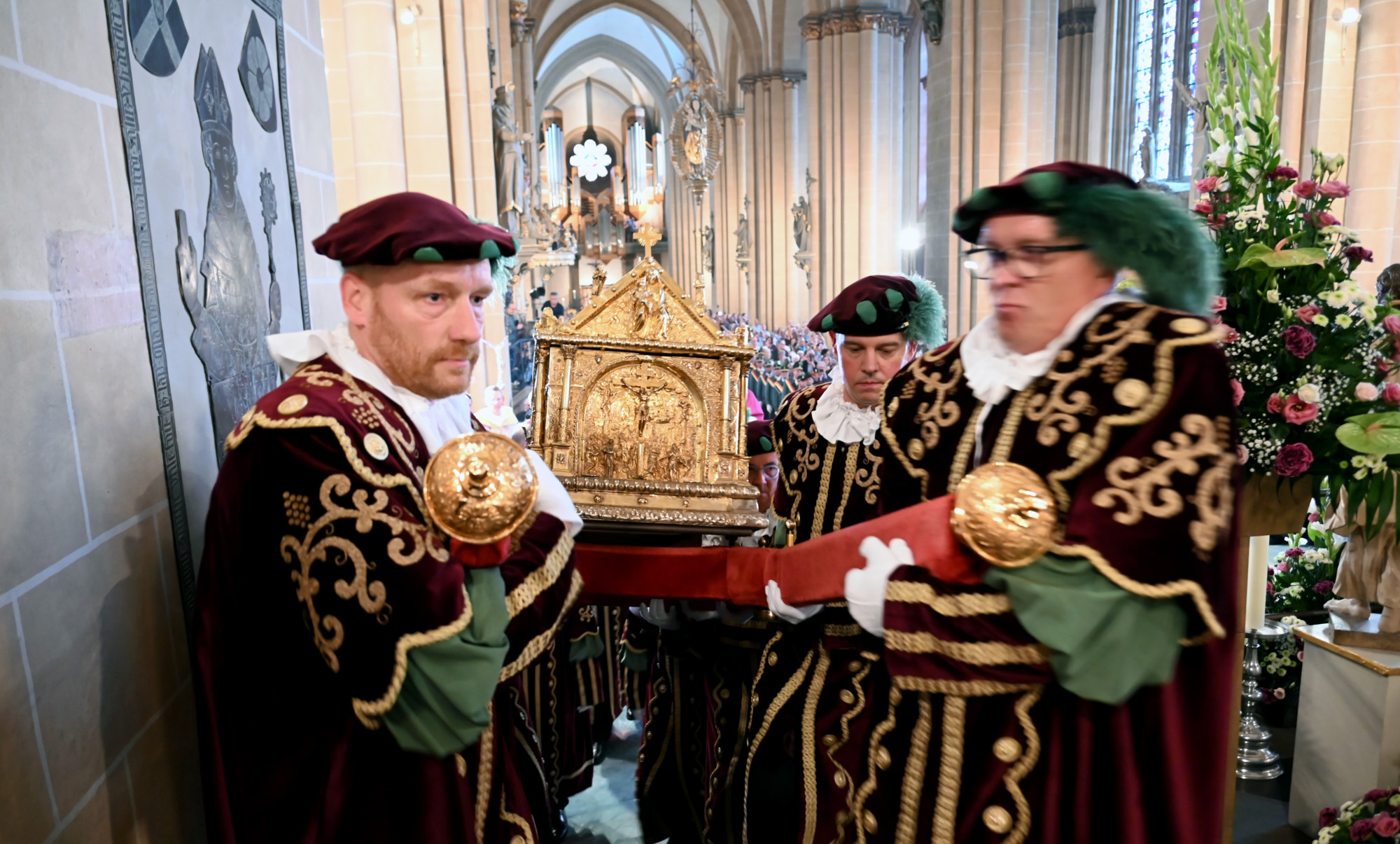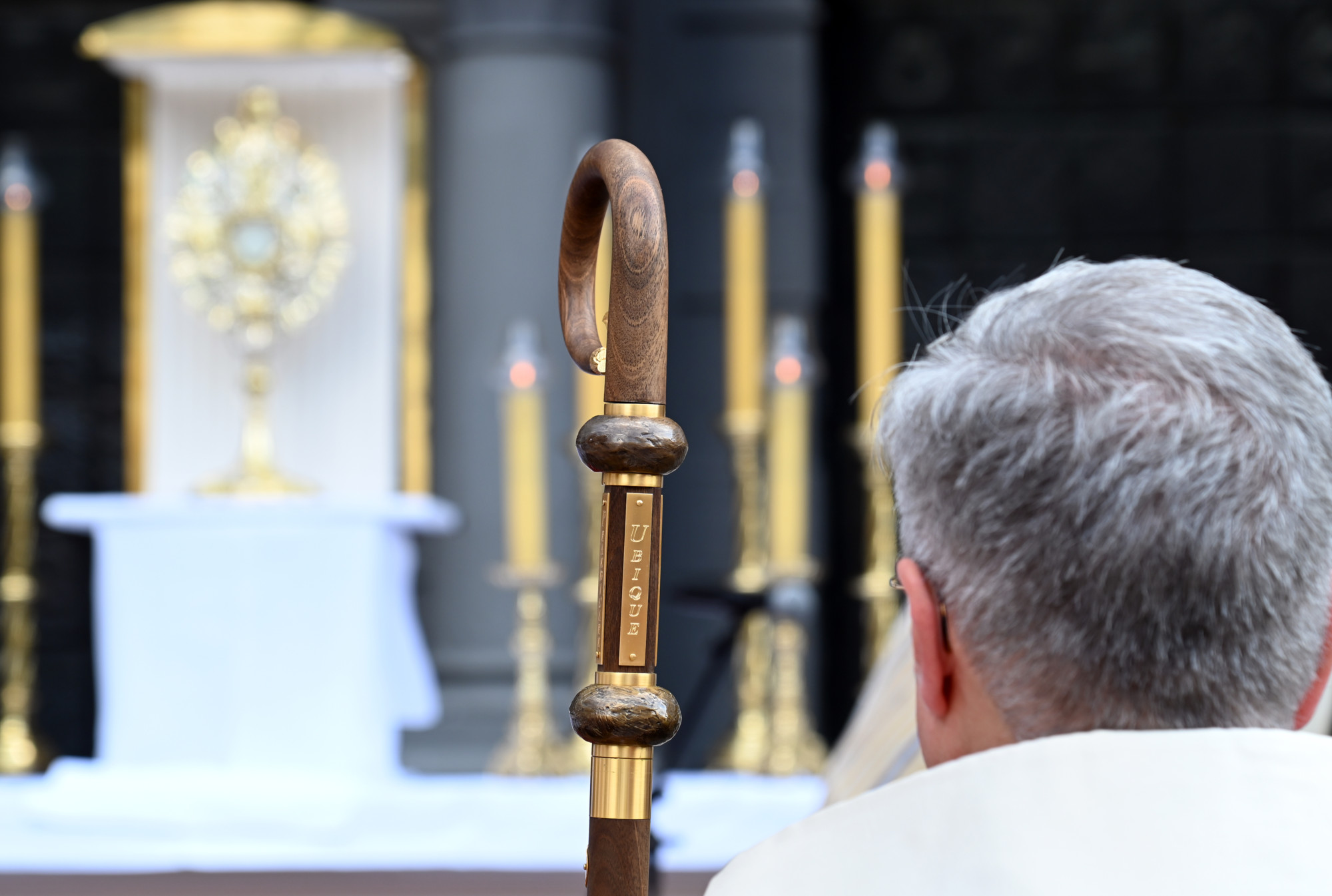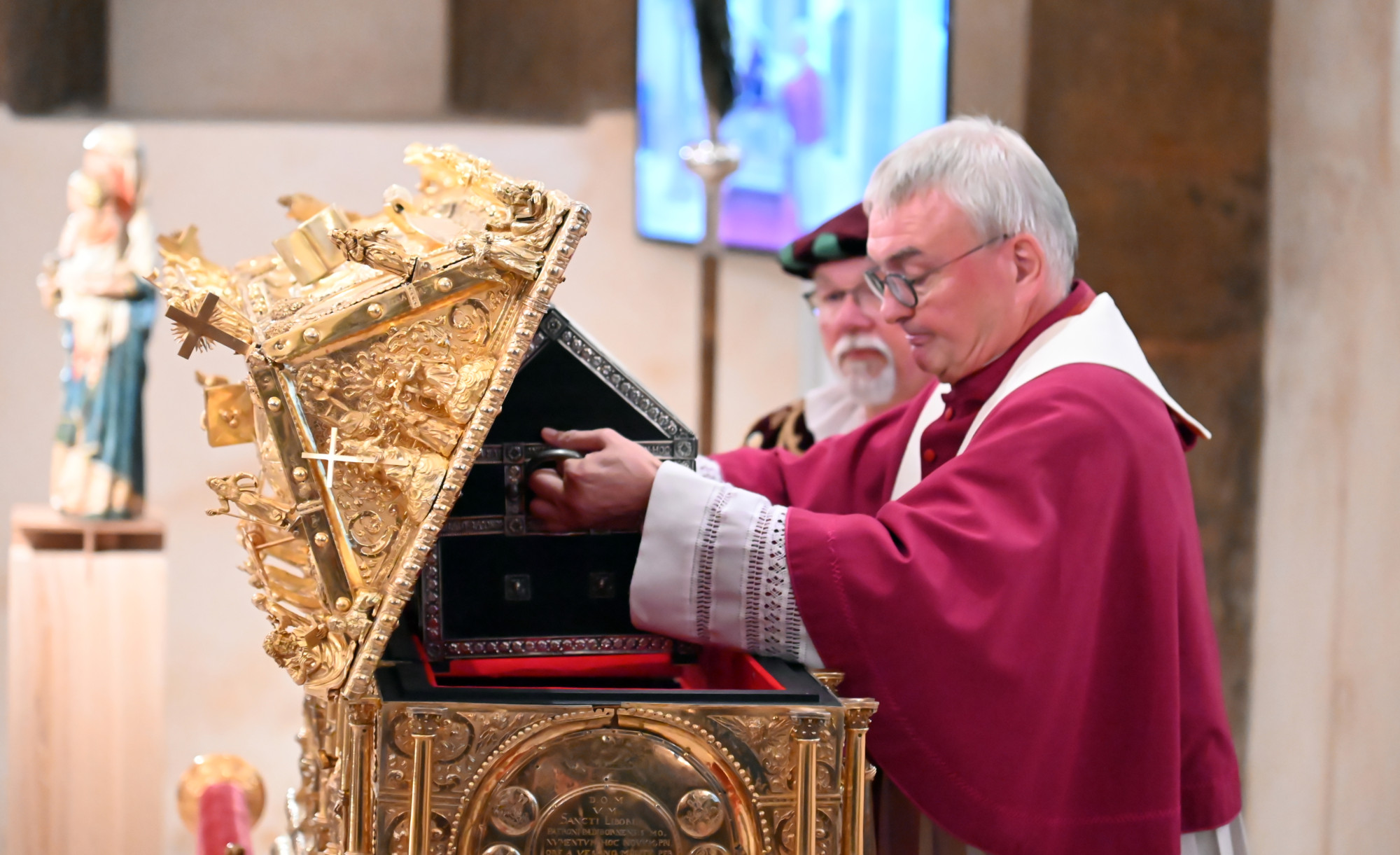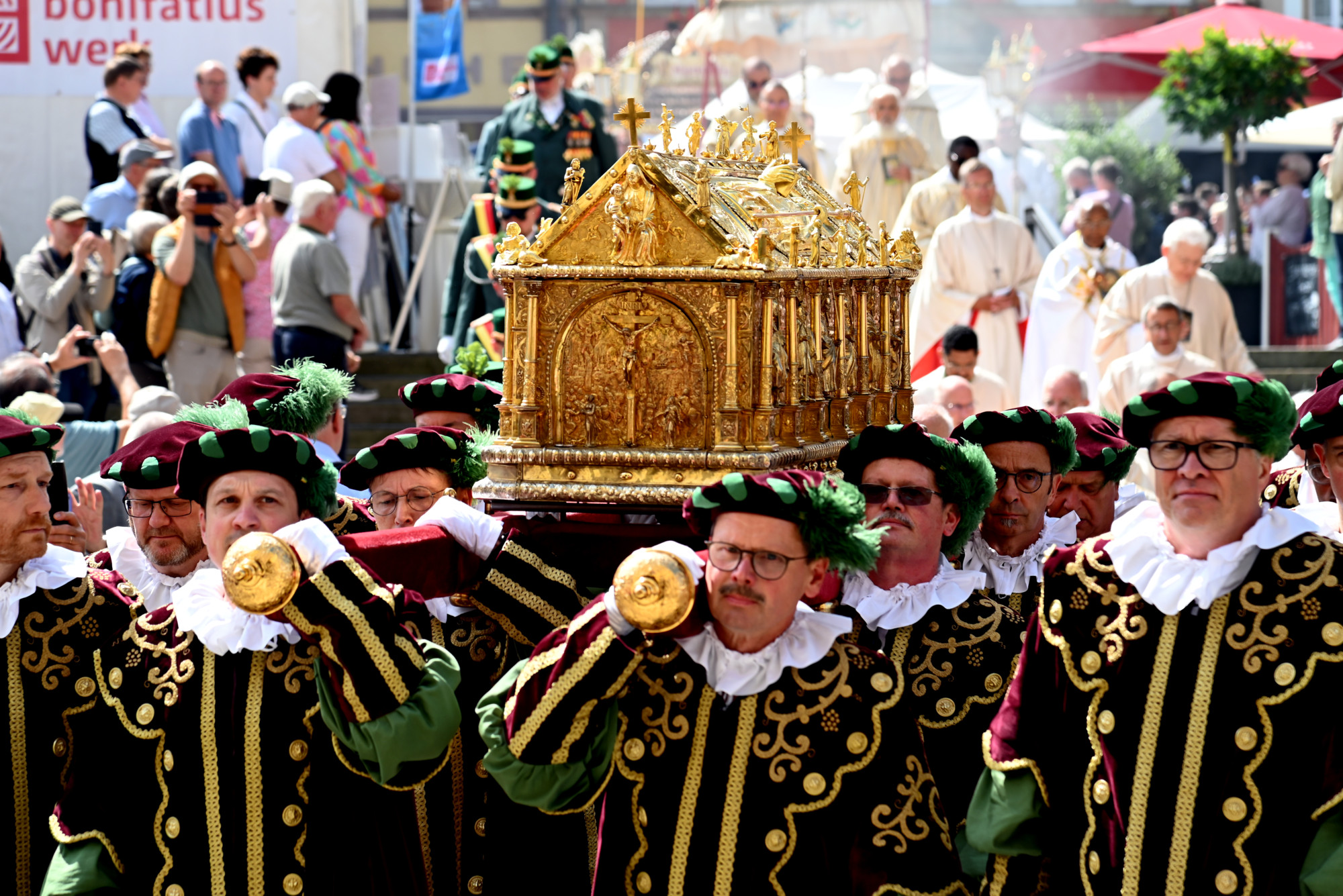Vor dem Paderborner Rathaus spendete Weihbischof Dr. Dominicus Meier OSB mit dem Allerheiligsten den sakramentalen Segen. Anschließend führte die Prozession zurück in die Paderborner Bischofskirche, wo der Reliquienschrein wieder im Hochchor zur Verehrung aufgestellt wurde.