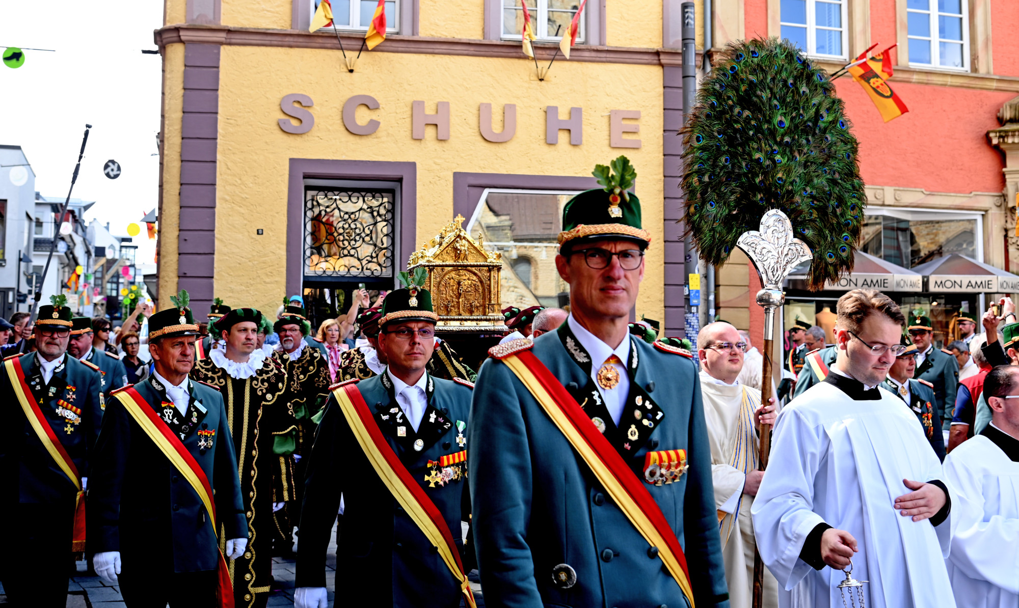 Nach dem Pontifikalamt im Dom wurden das Allerheiligste in einer Monstranz und die Reliquien des heiligen Liborius im vergoldeten Schrein in einer Prozession durch die Paderborner Innenstadt getragen. Die Gläubigen begleiteten „ihren“ Bistumspatron durch die Straßen, vorbei an Besuchern des Pott-Markts und an Menschen, die den Sonntagvormittag in den Cafés verbrachten. Dem von den Schreinträgern der Libori-Bruderschaft geschulterten Reliquienschrein wurde ein Fächer aus Pfauenfedern vorangetragen – dieser erinnert an den Pfau, der laut Überlieferung der Prozession vorangeflogen sein soll, in der im Jahr 836 die Reliquien des heiligen Liborius von Le Mans nach Paderborn überführt wurden.